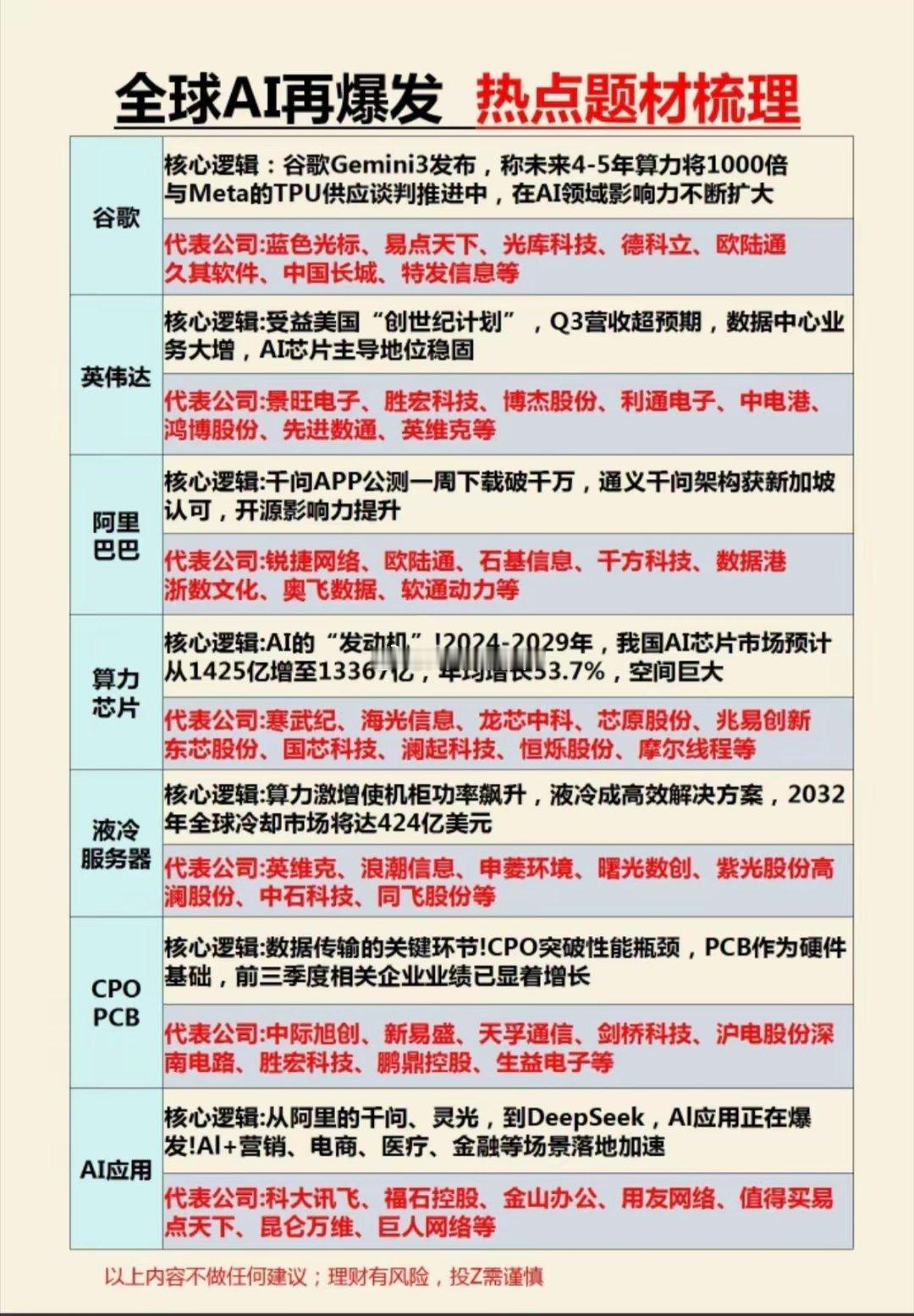 全球AI爆发:热点题材梳理!1.谷歌2.英伟达3.算力硬件,芯片4.阿里巴巴5.液冷服务器6.CPO,PCB