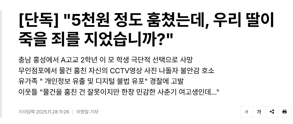 【韩国高二学生因偷窃5千韩元商品自杀,一场由非法人肉搜索引发的悲剧】海外新鲜事热点现场 今年9月23日凌晨,在忠清南道洪城郡A高中就读的高二学生李某(18岁,女)被发现在自己的房间内身亡。忠南洪城医疗院的尸检结果显示,直接死因是"缢死"。原本平凡高中女儿的突然死亡,这对家人的打击非常大。他们无法相信女儿会选择如此极端的方式结束自己的生命。在视若珍宝的女儿的死亡面前,父母痛哭流涕,但不能一直这样失魂落魄。父亲发现女儿在去世前,曾陷入难以忍受的羞耻和恐惧之中,这让他再次受到冲击。李某的父亲主张:"我女儿因被非法传播的监控视频照片,一瞬间成为了被嘲笑和侮辱的对象,在极度的绝望感之下,她选择了结束自己的生命。"那么,非法传播的监控视频指的是什么呢?因冰淇淋无人店铺丢失物品,为寻找嫌疑人,店主传播了未打码的监控视频照片去世的李某似乎曾在其学校附近的一家冰淇淋无人店铺,有2-3次未结账就拿走了商品。在她去世前一天与朋友聊天记录中,她也承认"因为没钱,在折扣店(无人店铺)偷了东西"。在与另一位朋友的SNS对话中,她提到偷窃的金额"大概5000韩元左右"。根据李某父亲向洪城警察署提交的控告状显示,该无人店铺的老板金某将包含该场景的监控视频截图照片给了一位他认识的开自习室的老板。因为平时有很多当地学生都会来这个自习室,于是收到照片的自习室老板则说"查查看是谁,必须找到偷东西的人",然后将监控截图发给了来自习室的学生们。根据控告状的证据资料,经确认这些都是事实。已故的李某在去世前,在与朋友的SNS对话中表现出极度的不安感在此过程中,李某的面部未经马赛克或遮挡处理就被传播了出去。瞬间,她的面部和个人信息就在洪城郡内的学生之间流传开来。在这个"拐个弯大家都认识"的小地方,最终这些照片也传到了李某和她哥哥那里。李某的哥哥在9月22日将此事告诉了母亲。李某的母亲给无人店铺业主打了电话,约定第二天见面解决问题,但李某彻夜苦恼,最终未能承受住那份压力,于23日凌晨5点30分之前(推测时间),在自己的房间里选择了缢颈这一极端方式自杀。"在背后指指点点、传闲话,我怎么承受得了"...曾诉说极度不安感的李某采访结果显示,已故的李某在去世前,与朋友的SNS对话中一直表现出极度的不安感。记者获取并查看了李某与朋友们进行的SNS对话内容,发现李某表现出"怎么办,啊,心在抖...说要赔几倍,今天真的想跳楼了"等心理不安。她还表达了恐惧:"在背后指指点点、传闲话,我怎么承受得了"。负责李某案件辩护的金亨奎律师也在27日与记者的通话中表示:"李某在自杀前,和两位亲密的朋友进行了大量的KakaoTalk对话。内容中可以看到'在洪城怎么还能抬头走路。没法去学校了。是在考虑跳楼死还是上吊死'这样的话,朋友们则在极力劝阻,看起来几乎可以肯定是因为这件事自杀的。"记者还从遗属处获取并查看了李某的学校生活记录簿、健康保险诊疗明细等,以确认是否存在与此个人信息泄露无关的、李某平时患有抑郁症或其他与死亡无关的因果关系,但并未发现特别的精神异常症状。相反,在学校生活记录簿上,记录着李某是"总是以开朗活泼的态度,带着微笑问候的可爱学生,人际关系融洽,喜欢和朋友相处,性格乐观,懂得尊重他人意见"。李某的父亲痛诉冤屈:"我的女儿遭遇了难以忍受的羞耻感和侮辱感。一想到女儿当时感受到的绝望和恐惧,到现在也感觉窒息。我们看着孩子手机里最后的文字,每天都活在泪水中。""偷东西固然不对,但正是敏感的青春期女高中生..."韩国现行的《个人信息保护法》明确规定:"处理或曾处理个人信息的个人,不得泄露因业务所知悉的个人信息,或无正当权限将他人的个人信息泄露给他人。"此事在当地社会的舆论反响也不好。在洪城经营个体生意的李某(51岁)在27日与记者的通话中表示:"我也是抚养孩子的家长,即使是高中生,孩子们个头虽然大,但精神上不还是小孩儿吗?当然,偷东西是不对的,但高二学生正是敏感的青春期时期,在一个拐一两个弯就能知道谁是谁家的小地方,教训教训不就行了吗,那样做(指传播照片)实在无法理解。"这位李某还指责了自习室老板,他愤慨地表示:"作为教育孩子的人,劝阻都还来不及,居然公然上传了照片,这让人无法理解。这么大的孩子去世了,去世的人固然可惜,但留下的家人余生该怎么过啊。"。已故李某的父亲表示:"更令人痛心的是,事件发生后,加害者们甚至没有表现出真诚的道歉或反省。他们不负责任的行为和态度给我们家人留下了又一次深深的创伤。必须对加害者进行坚决而严厉的处罚,同时,我们整个社会必须深刻认识到数字信息非法传播的严重性。"李某遗属以违反《个人信息保护法》、《信息通信网法》为由控告无人店铺业主和自习室代表至洪城警察署遗属们于去年10月14日,以违反《个人信息保护法》和《信息通信网法》为由控告了无人店铺老板,并以违反《信息通信网法》为由控告了自习室老板至洪城警察署。采访结果显示,无人店铺老板已结束警方调查,自习室老板则已聘请律师进行应对。洪城警察署调查2组的负责警官表示:"调查已进入收尾阶段。无人店铺老板那边也聘请了律师,等那边提交立场后,很快就会(向检方)移送,但目前还在调查中,具体内容不便透露。"最终会得出