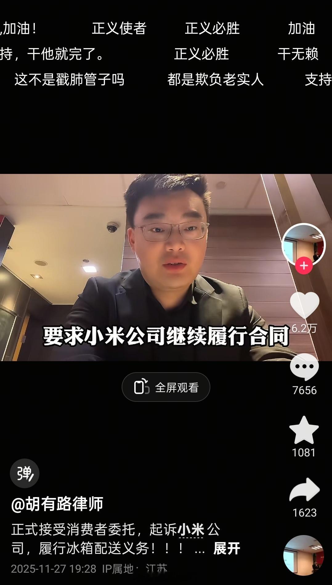 胡律师跟小米杠上了,上周起诉小米手表是否有潜水功能,昨天又接了11元秒杀小米冰箱的单子,要求小米履行配送冰箱的义务