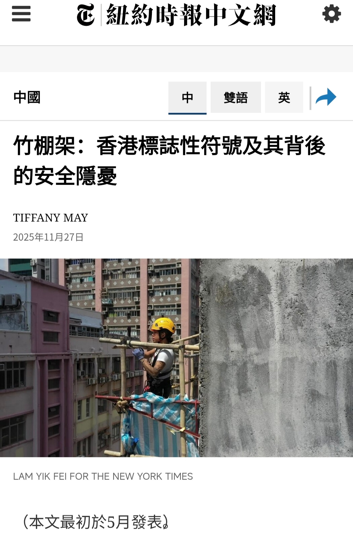 香港大埔大火严重程度非常罕见很感慨,重大火灾的发生和蔓延往往都是多因一果,但现在个别人类强行为“竹棚架”洗白,要把它们从追责议程里摘出去。个别一贯故作高深的大V几乎连脸都不要了!¹ 刚刚,纽约时报把一篇专门写竹棚架的文章,又发了一遍,中文题目是:《竹棚架:香港標誌性符號及其背後的安全隱憂》。² 划重点:原来很多、很多人早就知道,竹棚架有重大安全隐患!⚠️“今年3月,發展局發布備忘錄,要求至少一半的政府項目使用金屬棚架,旨在逐步推廣現代工藝適用範圍、提升安全性。”“發展局在聲明中稱,金屬棚架防火性能更佳,且更堅固耐用。⚠️該局說,無完全淘汰竹棚架的打算,「尤其是在工地環境狹窄等特殊情況下。」“前香港工程師學會建築分部主席謝偉正表示,一系列涉及竹結構的工業事故引發了安全擔憂。隨著摩天大樓越來越高,建築材料也更多地採用玻璃,金屬棚架更適合大型建設項目。”“對於金屬棚架,工程師可根據荷載和極端天氣等因素計算確定管材厚度、環鎖間距等參數;但竹棚架無法做到這一點,因為竹竿形狀不規則,全憑竹棚師傅的經驗判斷。”³ 纽约时报太鸡贼了!它今年5月发文,是想说“竹子坚韧,像香港精神”。现在大火死伤严重,中文题目是图2!⁴ 这句话最感讽刺。「如果這項傳統在我們手中消亡,那就太可惜了,」有一句类似的话,叫“祖宗之法不可变”。热点科普