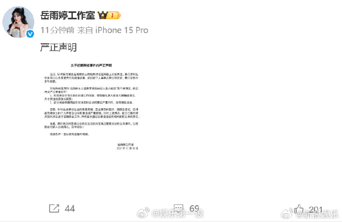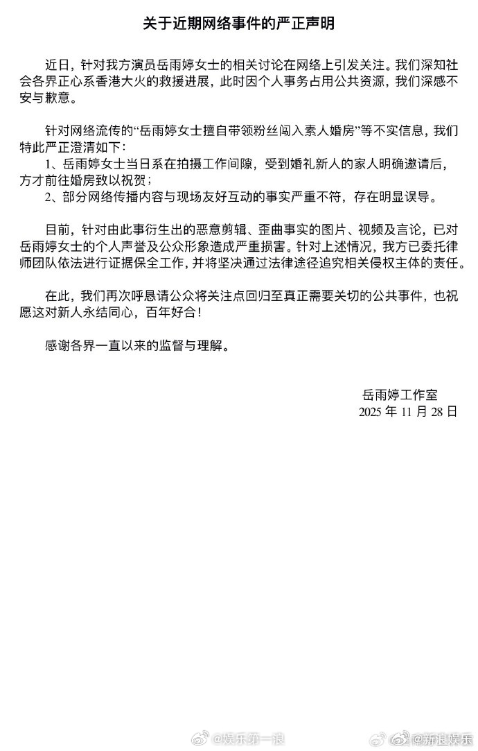 岳雨婷方回应岳雨婷否认闯素人婚房 28日,曝岳雨婷闯素人婚房讨喜糖引热议。刚刚,发声明回应称岳雨婷是受到婚礼家人明确邀请后才进入婚房,网传内容与事实严重不符,已委托律师取证。