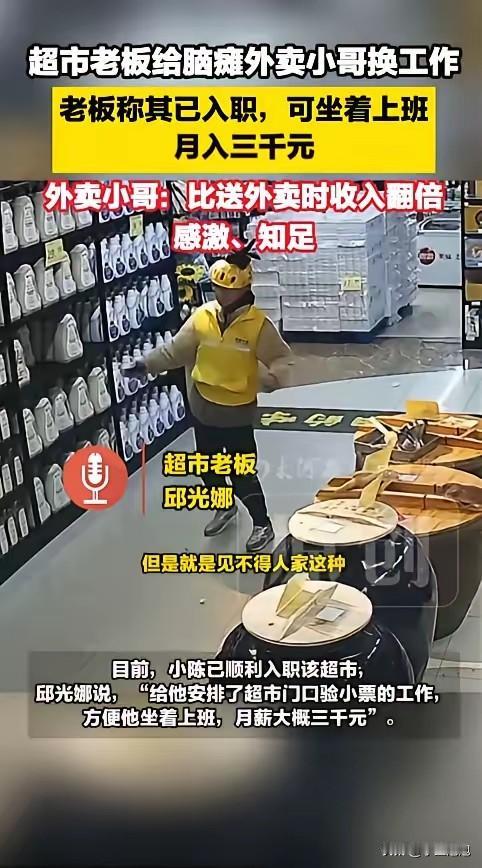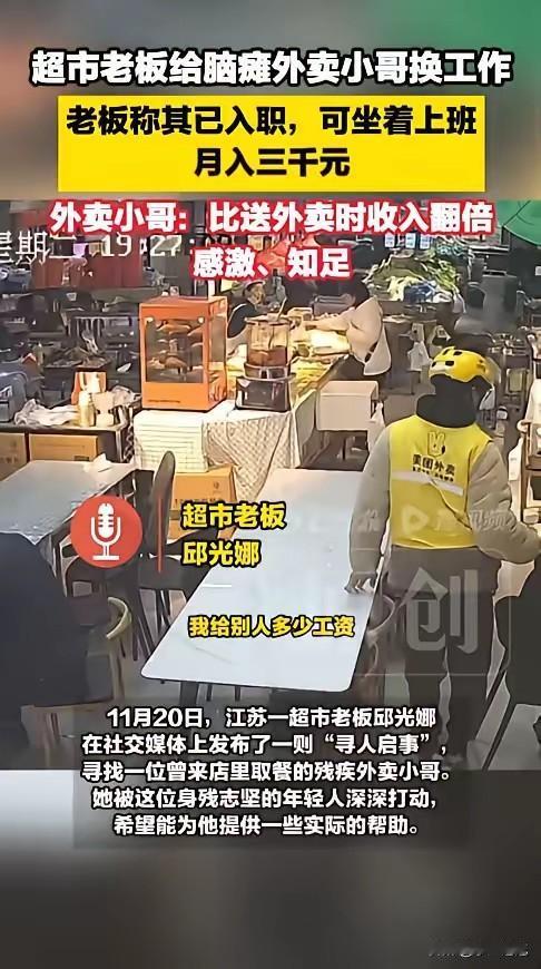 江苏宿迁超市一老板,由于一时疏忽让一外卖员在店内白白等了很久,她感到十分愧疚,果断发布寻人启事,寻找这位残疾外卖小哥。哪料,见面后才发现,这位19岁小伙因脑瘫求职屡屡碰壁,月收入曾低至两三百元。没想到,邱光娜的一个决定,不仅让他重获工作,还意外点燃了更多希望。 据豫视频11月26日报道 宿迁超市经营者邱光娜通过社交平台发布“寻人启事”,寻找此前因自己疏忽而等待许久的残疾外卖小哥。据邱光娜介绍,她见到这位名叫小陈的19岁小伙时,对方因脑瘫导致行动不便,送单途中在寒风里摔倒两次,膝盖衣物还沾着泥土。 经沟通了解,小陈初中毕业后多次求职均因身体原因被拒,最终只能从事外卖行业,此前月收入最低仅两三百元,甚至难以负担奶奶的降压药费用。邱光娜当场决定为其提供岗位,将超市门口验小票的工作调整为可坐着完成的内容,每月支付工资3000元。 11月22日,小陈已正式入职该超市。邱光娜表示,给小陈的工资标准与其他员工一致,岗位调整仅为适配其身体状况。 截至目前,相关内容在社交平台传播量超百万。有网友质疑此举存在“作秀”嫌疑,认为3000元月薪在宿迁难以覆盖生活成本;也有大量网友表示支持,有市民专门到超市购物并主动找小陈验票,部分人还为其送去水果等物品。 据当地就业部门数据,2025年宿迁残疾人就业帮扶岗位中,适配肢体、智力障碍群体的岗位占比不足12%,多数残障求职者仍面临“岗位少、适配难”问题。邱光娜的做法被当地残联列为“民间帮扶典型案例”,后续将推动商超、便利店等行业增设类似岗位。 各位读者你们怎么看?欢迎在评论区讨论。 信源:豫视频2025-11-26——超市老板给脑瘫外卖小哥换工作:已入职,可坐着上班,月入三千元