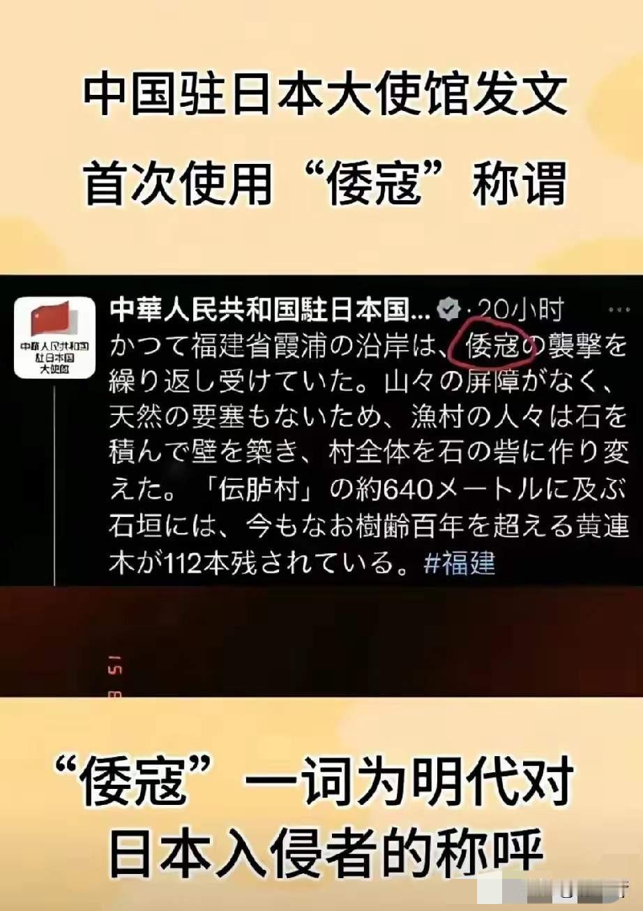 解气!中国驻日大使馆发文称日本为倭寇! 这也是近些年来首次对他们这样称呼!之所以这样称呼是因为高市早苗触碰了中国原则的红线! 倭为矮 寇为贼!古人曰:倭人 知小理而无大义,拘小节而无大德,重末节而轻廉耻!畏威而不怀德,强必寇盗 弱必卑伏! 老祖宗真是有智慧,倭寇这个词用在他们身上太贴切了! 过去为了能够和平相处,还都给他们留着面子!如今有些人先挑衅所以我们也不用再客气了!