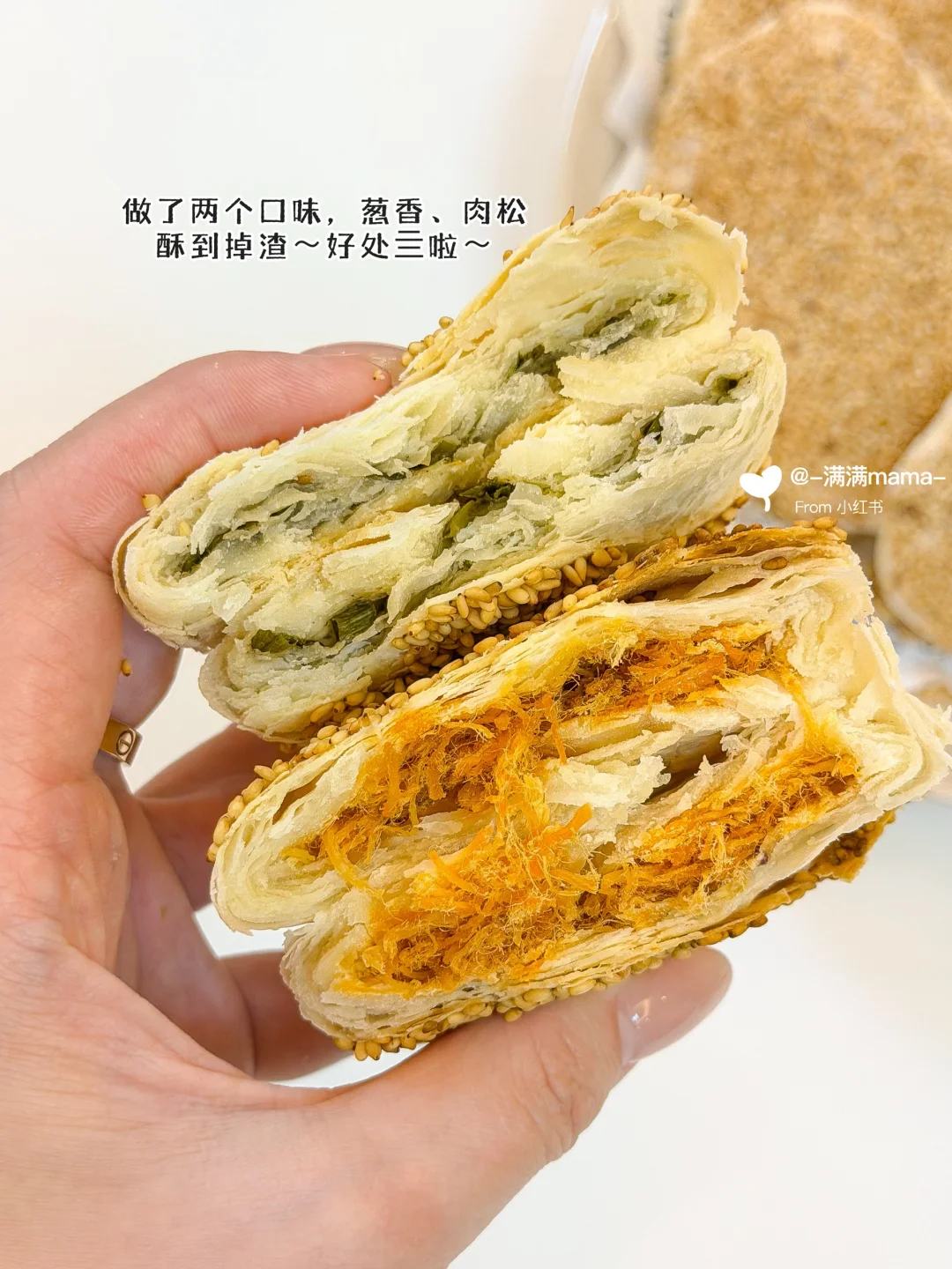 金黄酥脆,香气直往鼻子里钻[偷笑R],拿在手上轻飘飘的,一碰就酷酷掉渣,吃的时候一定要用手接住哦[捂嘴笑R]