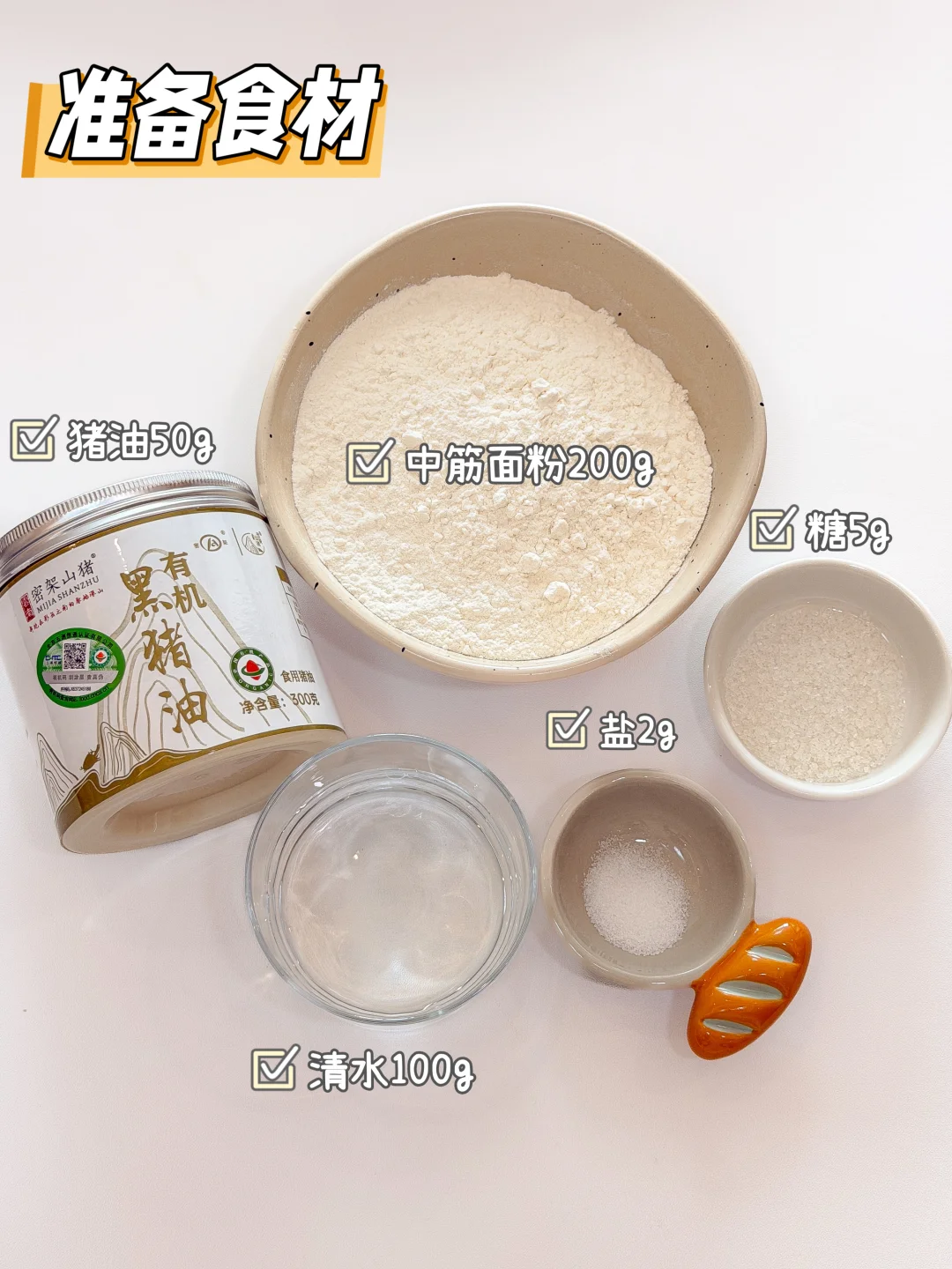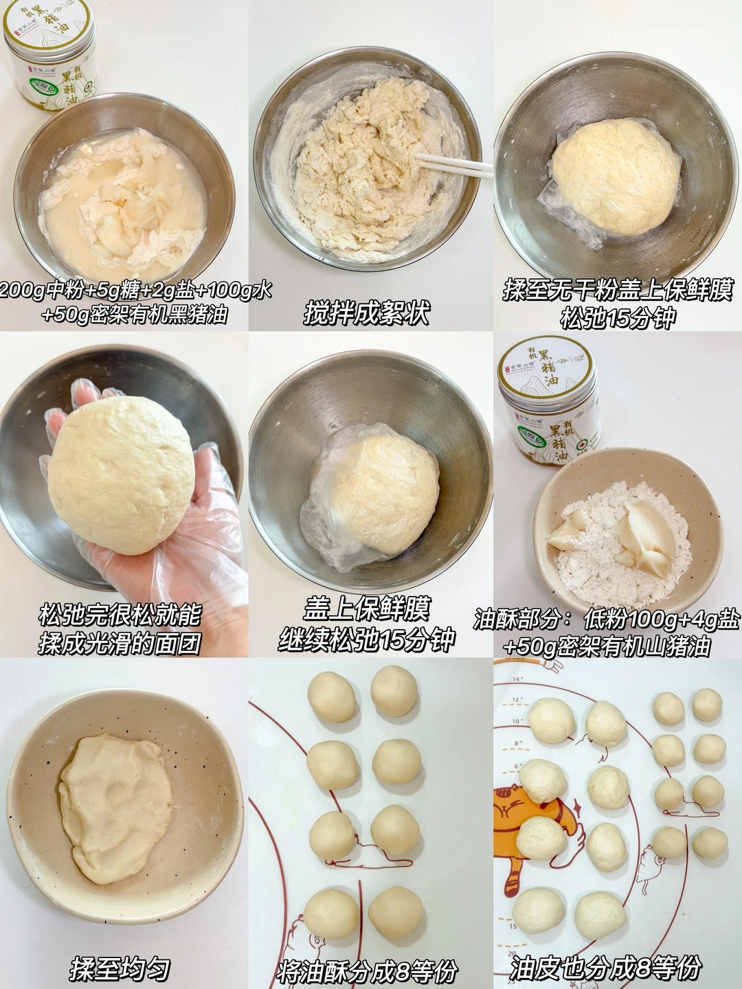 油皮部分:中筋面粉200g|密架山猪有机黑猪油50g|糖5g|盐2g|清水100g