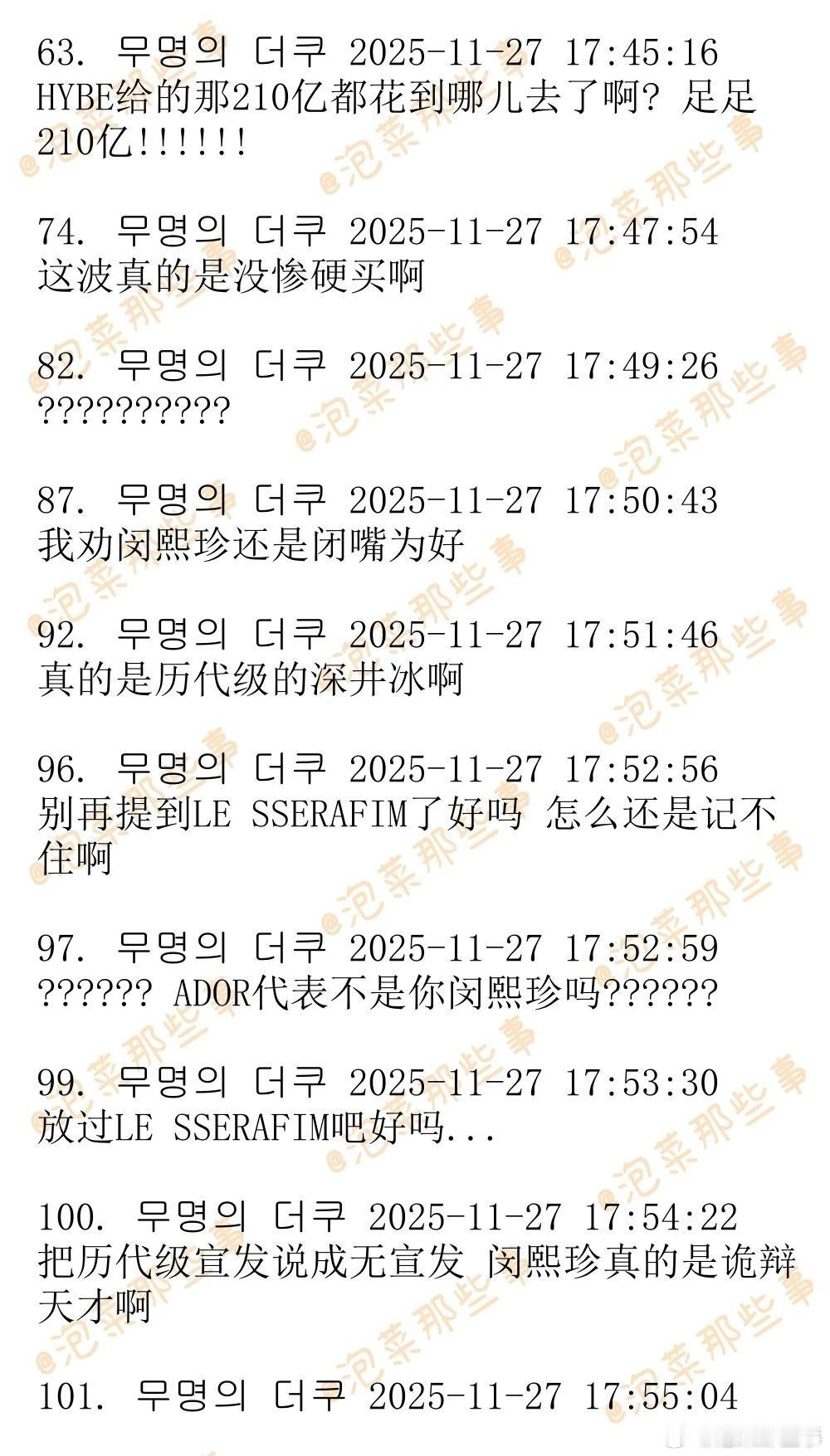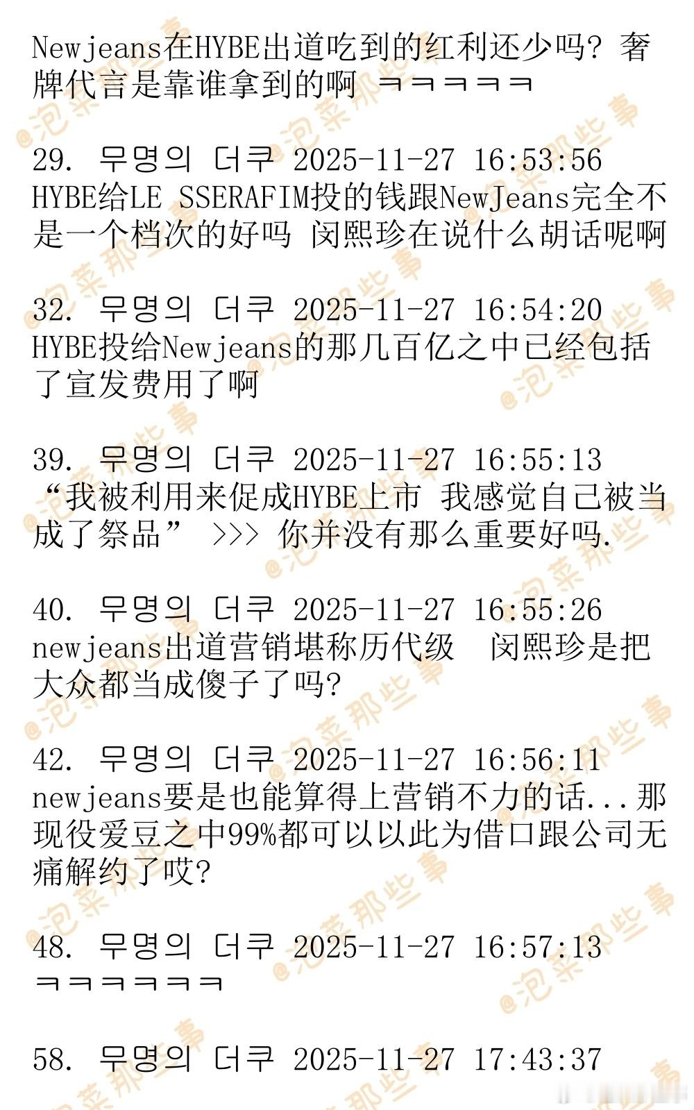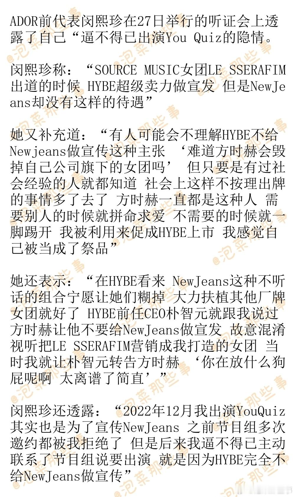 🔥韩网热帖评论翻译🔥闵熙珍:HYBE营销LE SSERAFIM超卖力 但却完全不给NewJeans做宣传 ADOR前代表闵熙珍在27日举行的听证会上透露了自己“逼不得已出演You Quiz的隐情。闵熙珍称:“SOURCE MUSIC女团LE SSERAFIM出道的时候 HYBE超级卖力做宣发 但是NewJeans却没有这样的待遇”cr.theqoo