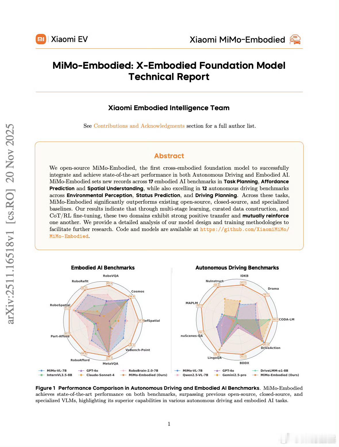 小米发布并开源具身基座模型MiMo - Embodied,并同步开源技术报告、代码及完整模型。人类在厨房烹饪、客厅整理、道路通行等不同场景中,能依靠同一套对空间、物体及动态规律的通用理解能力完成行为切换,这一现象为AI技术研发提供了关键启发。从技术本质来看,机器人与自动驾驶系统的核心诉求均围绕感知、理解物理世界及预测动态变化展开,理论上可共享统一的物理世界认知框架。该模型通过多阶段预训练、思维链(CoT)及强化学习(RL)微调等技术路径,验证了自动驾驶与机器人数据间显著的正向迁移效应和相互强化价值。经实验验证,该模型在自动驾驶与机器人领域的29个权威基准测试中均达到当前最优水平(SOTA),同时完整保留通用视觉语言能力,充分证明了“统一具身智能大脑”的技术可行性。