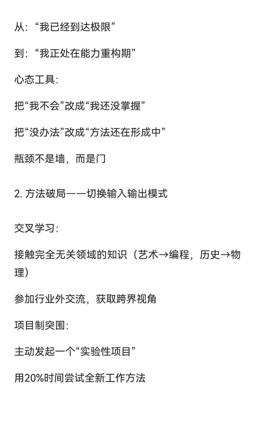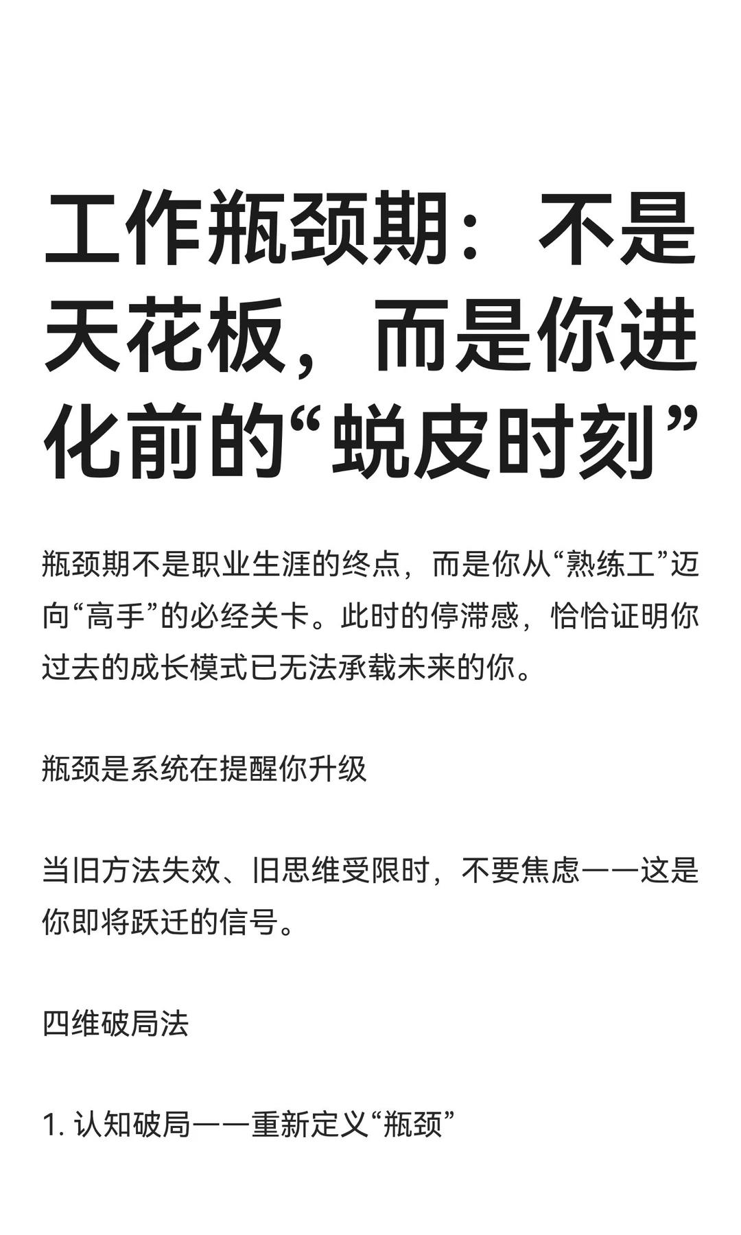 工作瓶颈期:不是天花板,而是你进化前的“ 瓶颈期是职业成长的必经阶段,提醒我们从“熟练工”迈向“高手”。通过认知、方法、能量和视角的破局,我们能重新定义挑战,切换输入输出模式,修复内在资源,并拉长时间与空间维度,最终找到突破路径。