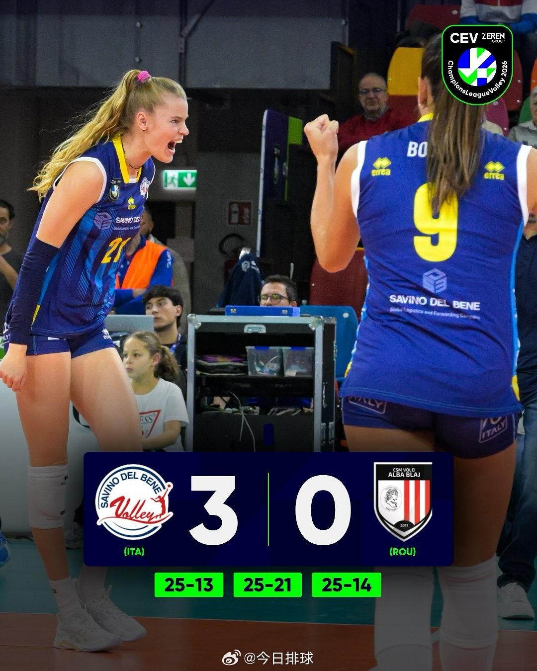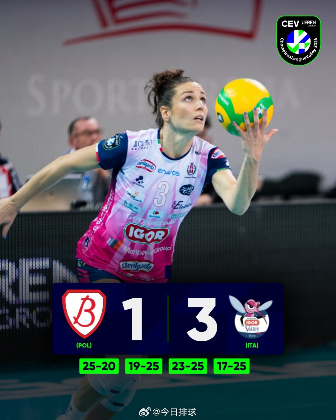 【2026女排欧冠 正赛小组赛第1轮:四支意大利俱乐部获全胜】小组赛第1轮共10场比赛北京时间28日凌晨战罢,参赛的诺瓦拉、科内利亚诺、米兰和斯坎迪奇等四支意大利俱乐部在各自的小组分别战胜了罗兹建设、泽仁体育、奥林匹亚科斯和阿尔巴布拉日,获得全胜。