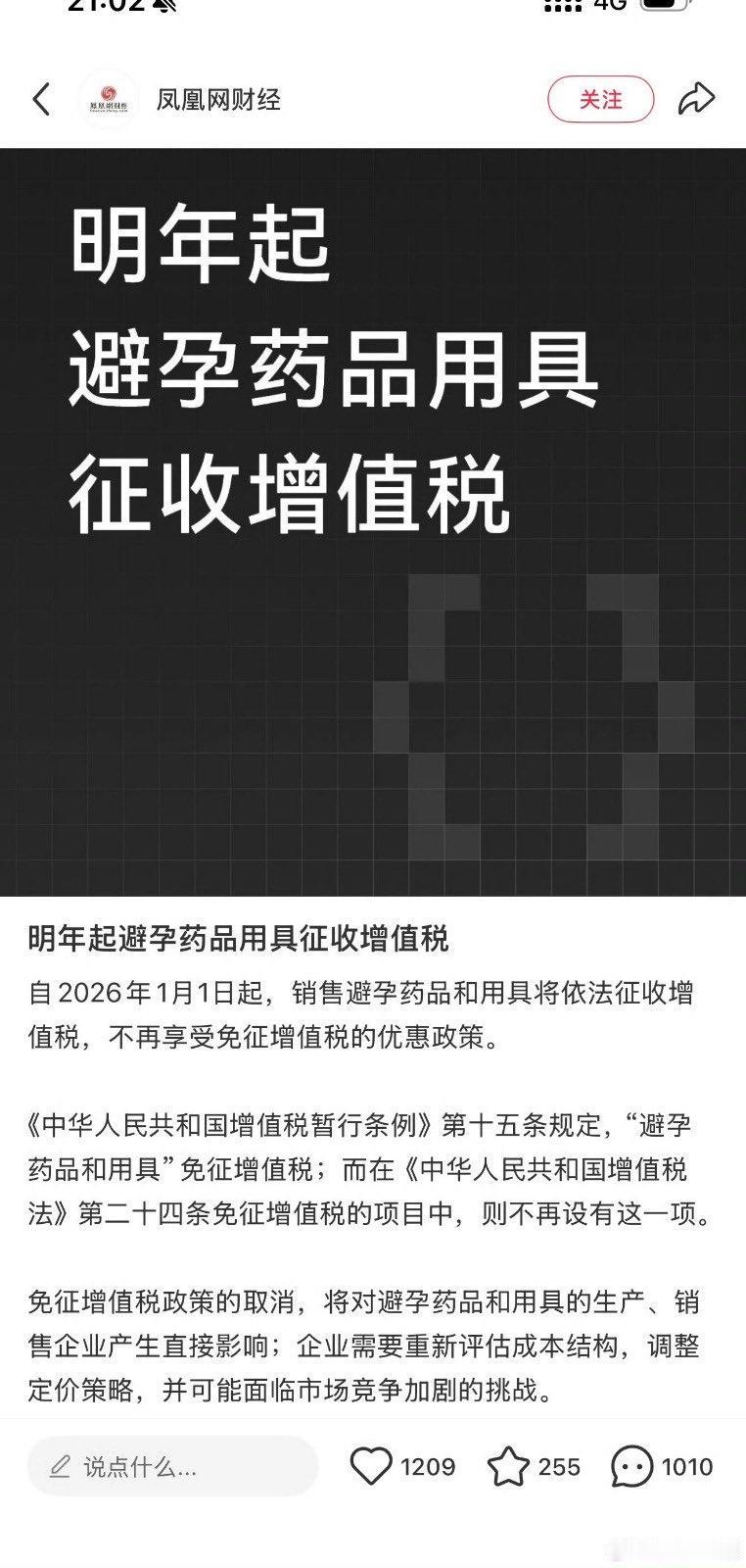 明年起 避孕药品和用具 将开始征收增值税。 1993年通过的《增值税暂行例》, 避孕药和用具明确列为免征增值税项目。 此后在2008 年、2017 年的修订中, 这一免税政策都被继续保留。 2024年12月通过的《增值税法》, 正式取消避孕药品和用具的免税待遇。 新法将于2026 年1月1日实施。 这意味着 1994第一天到2025年最后一天 30年免税历史将结束。 从明年开始, 相关产品价格可能会上涨。