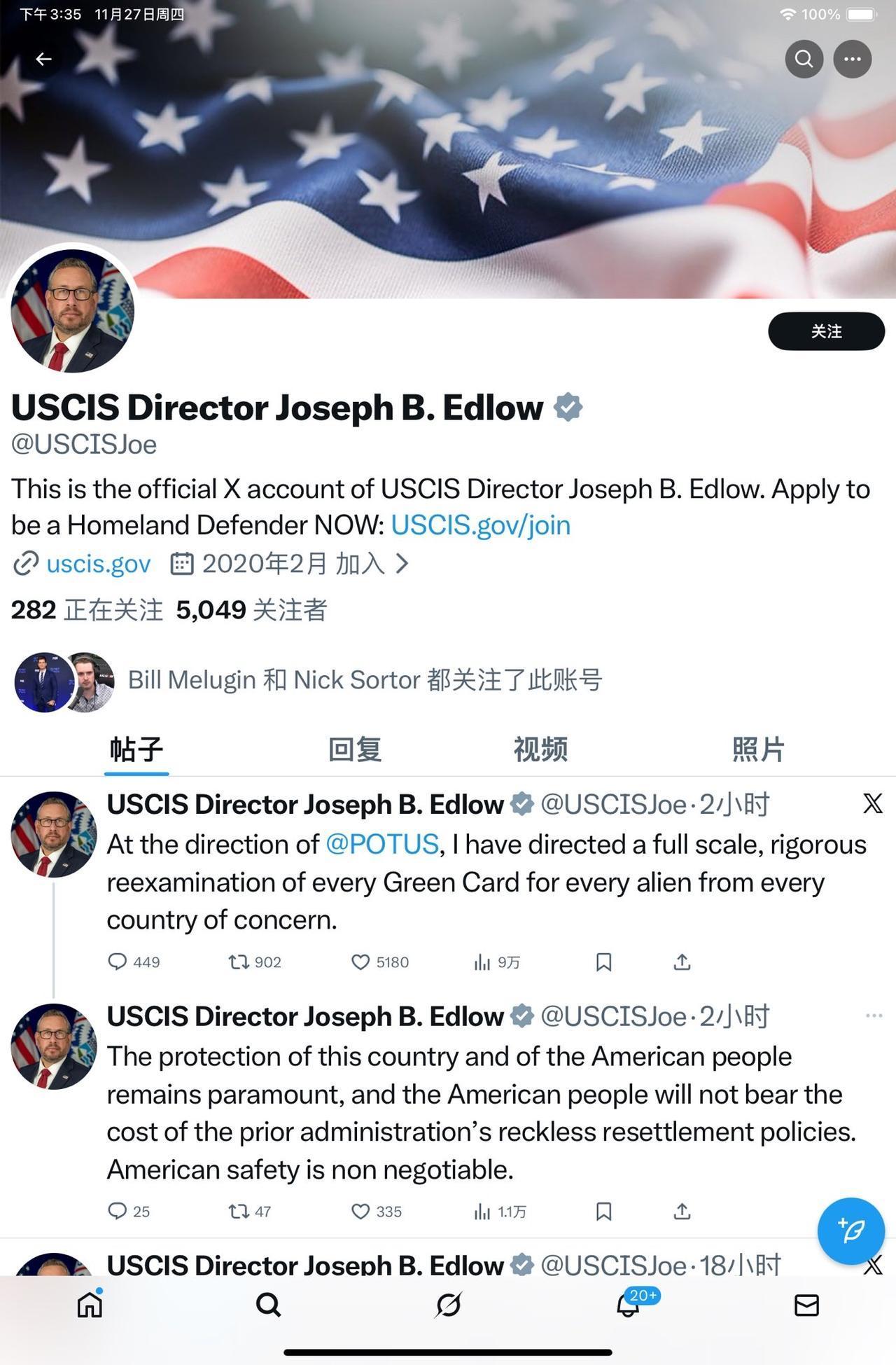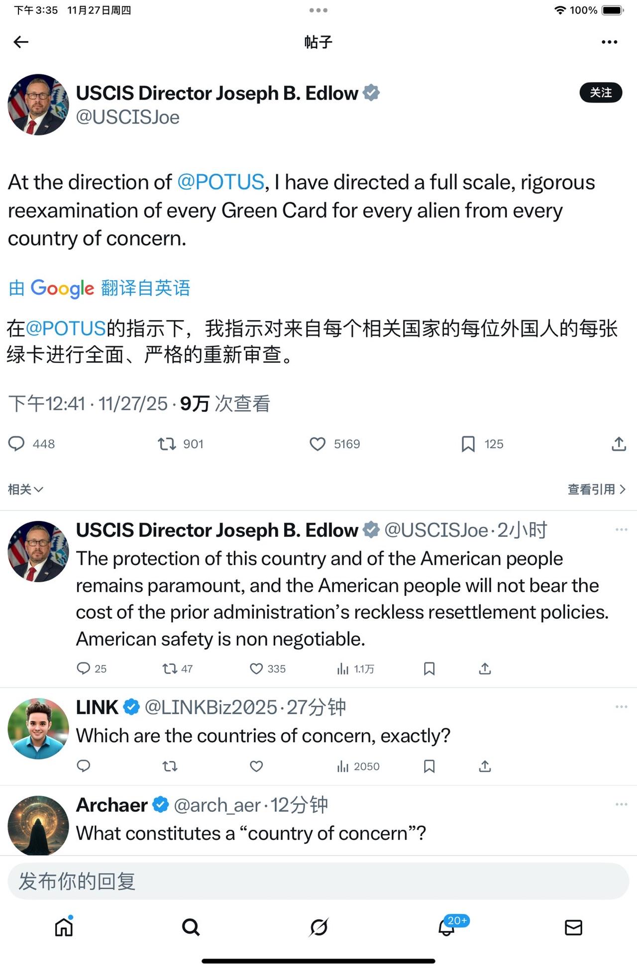🚨💥💥💥突发:昨日枪击案后,美国将大规模重新审查第三世界移民的绿卡,甚至可能批量取消! ⚠️美国公民及移民服务局(USCIS)宣布启动全面、严格的复核计划: 对所有来自“重点关注国家”的外国人——每一张绿卡都要重新审查。 🔥USCIS(美国公民及移民服务局)主任Joseph Edlow刚刚在推特上发表官方声明帖: “根据总统的指示,我已下令对所有“重点关注国家”的所有外国人所持的每一张绿卡,进行全面、严格的重新审查❗️❗️ 保护这个国家和美国人民始终是最重要的,美国人民不应再为前任政府鲁莽的安置政策付出代价。 美国的安全,不容谈判‼️” ⚠️ 注意: 不仅是非法移民, 连“合法”持绿卡的外国人也在范围内‼️ 原文的态度非常强硬,其实暗示着: 这些人要是审查不合格,都会立即返回原籍国,并永久禁止再次入境‼️
