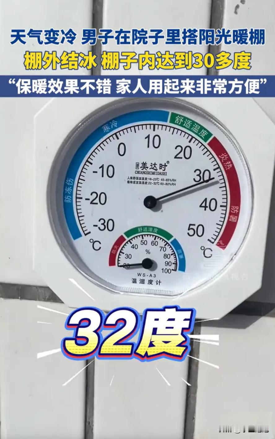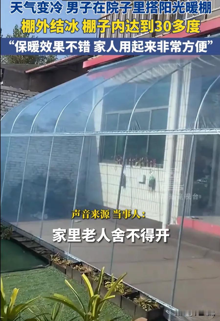 这是真聪明!河北石家庄,天气变冷后,一男子突发奇想在院子里花1000多块钱搭了一个阳光暖棚,没想到效果出奇的好,棚外的水都结冰了,棚里面最高却能达到30多度,网友:这不会有味道吗? 11月下旬,石家庄气温降到零下,户外水管开始结冰。该男子看家里老人舍不得开暖气,总裹着厚棉衣缩在沙发上,便自己买了钢架和透明篷布,花两天时间在院子里搭出这个暖棚。 暖棚搭好当天,他在棚内棚外各放了一支温度计。次日早上查看,棚外显示零下2度,花盆边缘结了薄冰;棚内温度计指向28度,老人进去坐了十分钟,就把外套脱了。 现在每天上午,一家人会搬桌子进棚里吃饭。阳光透过篷布照下来,碗里的粥凉得慢,老人说“比屋里暖气还舒服”。棚里还放了老人养了五年的兰花,之前每年冬天都要搬进屋,今年不用折腾,叶片比往年更绿。 有网友在视频下留言,问“棚子不通风,会不会闷出味道”。男子随后拍了补充视频:棚子侧面留了两个拉链口,中午温度高时拉开透气,既能散湿气,又不会让棚内降温。 还有网友算成本:当地暖气费一个冬天2000多元,这个暖棚只花1000多,不仅能给人取暖,还能保住院子里的花草,“比交暖气费划算”。男子回应,自己本来只是想让老人舒服点,没想到顺带省了钱。 近期多地降温,不少网友分享过冬小技巧:有人用泡沫箱给菜苗保暖,有人在窗户上贴塑料膜。但这个暖棚的实用性更高——不用插电,全靠阳光聚热,老人待在里面不闷,花草也能正常生长。 我认为,这个暖棚火起来,不是因为多新奇,是它戳中了普通人过冬的痛点:既想省钱,又想让家人舒服。很多人冬天纠结暖气开不开,开了费钱,不开冻人,这个办法把“晒太阳”变成了可利用的取暖资源。 前几天看到邻县有户人家模仿这个做法,在阳台外搭了小暖棚,用来放家里的多肉,效果同样不错。还有人提出,可以在暖棚里加个小风扇,中午帮忙循环空气,进一步提升舒适度。 目前该男子的视频在本地平台已经有10万+播放,不少人私信问他篷布和钢架的购买链接。他说,自己只是随手分享,没想到会有这么多人关注,“能帮大家解决点过冬的问题,挺开心的”。 现在北方多地进入严寒模式,暖气费、电费成了不少家庭的支出负担。这个暖棚的思路,给了大家一个新参考:不用依赖电器,借助简单材料就能把自然热量留住,既省钱又实用。 有人担心暖棚晚上会降温,男子说,晚上他会在棚子外层再盖一层厚布,能保住部分温度,老人偶尔晚上进去坐一会儿,也不会觉得冷。 各位读者你们怎么看?欢迎在评论区讨论。