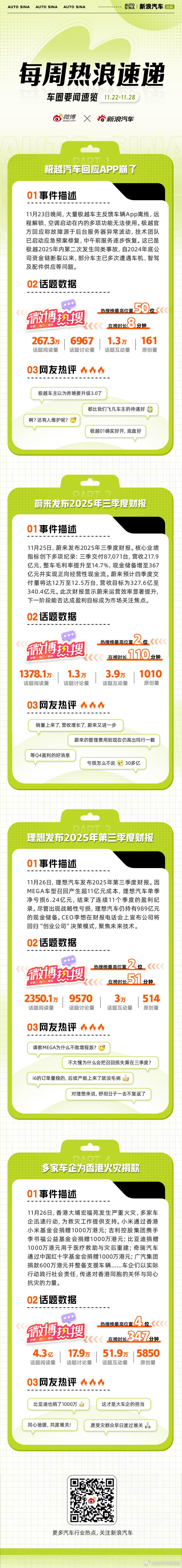 本周车圈热点不断:极越汽车回应APP崩了,引发公众对智能汽车断网风险的讨论;蔚来发布2025年三季度财报,四季度盈利表现受关注;理想发布2025年第三季度财报,因MEGA召回事件利润减少11亿元;多家车企为香港火灾捐款,以实际行动践行社会责任。