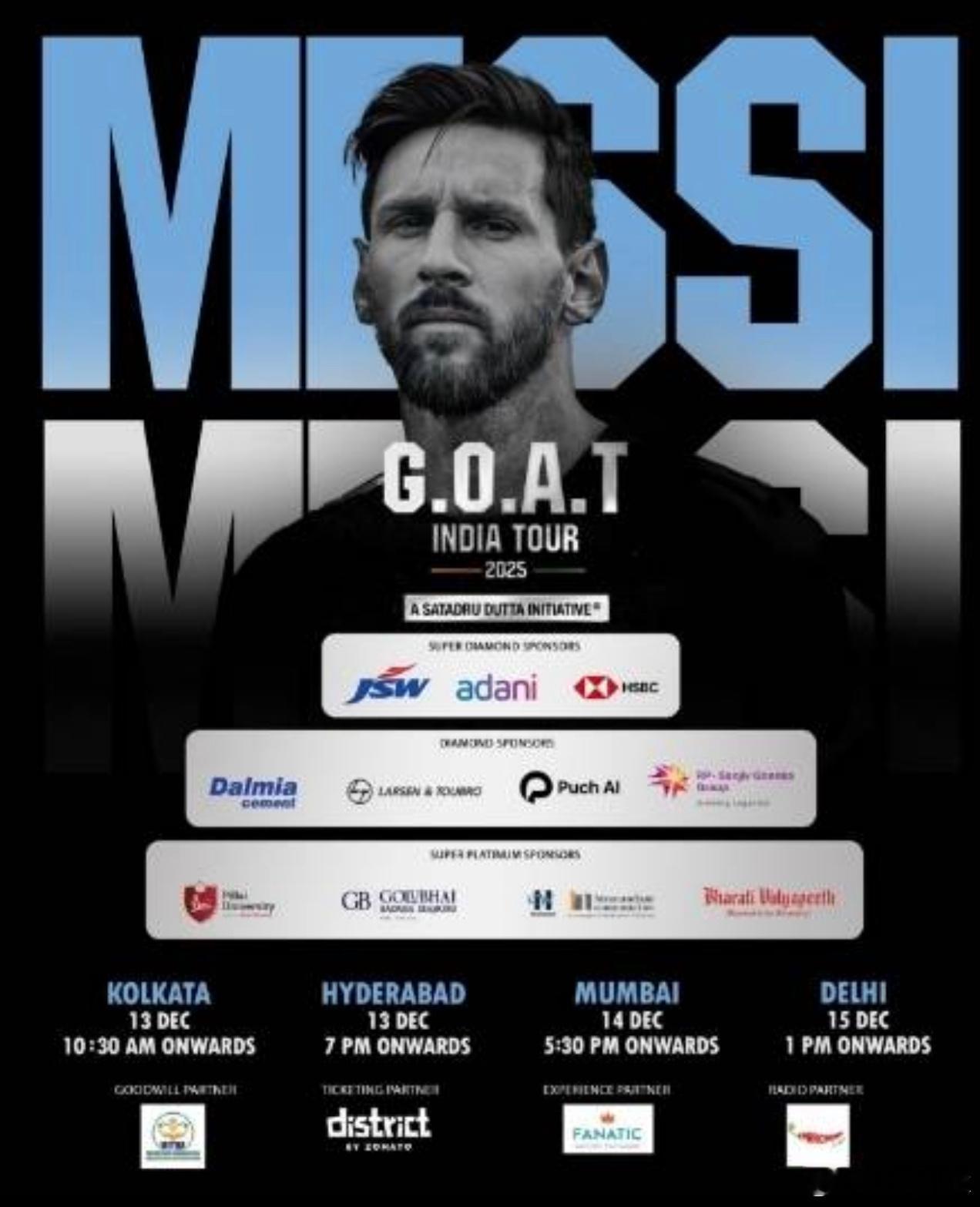 11月28日讯 梅西在个人社交媒体上发出了其印度行的行程,除了此前确定的加尔各答、孟买和德里三站之外,又新增了海得拉巴站。梅西在社交媒体上写道:感谢来自印度的所有厚爱!GOAT印度行将于几周后正式开启!很高兴与大家分享,此次行程在加尔各答、孟买和德里之外,新增海得拉巴站。很快见面啦!根据外媒freepressjournal的报道,梅西将在下个月开启个人的印度行,他将造访4座城市,分别是12月13日上午10点30分抵达加尔各答,下午7点抵达海得拉巴,14日下午5点30分抵达孟买,15日下午1点抵达德里。其中,海得拉巴是新增的一站,与加尔各答安排在同一天内。此前,艾哈迈达巴德曾被列为梅西印度行的城市之一,喀拉拉邦亦是其中一站,因为阿根廷队原定在科钦举行一场友谊赛。但这两站活动均已取消,海得拉巴则成为了替代城市。梅西梅西