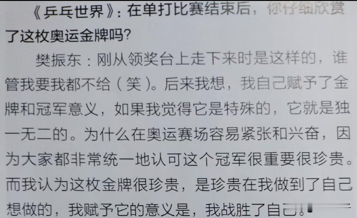 我是樊振东的访谈粉。 记得乒乓世界2024年10月刊 的采访,樊振东说了这段话,让我非常震撼。他说;“我赋予这块金牌的意义是,我战胜了自己。” 这让我们看到,他用内驱力或外驱力不断地平衡“过程”和“结果”关系的同时,其实他也在寻找自己自洽的途径。 樊振东是属于真诚又聪明的人,真诚体现在他所有采访都没说过违背本心的假话,不会故意粉饰太平,但是不该说的话或者是当下还不能说的话,他一个字也没说,这是他的聪明之处。 在所有的访谈节目里,樊振东逻辑严谨,遣词造句精准流畅,思维缜密,而且他总是言之有物,绝不空谈,绝对是顶流的最有内涵、最有思想的运动员。 我敬佩小胖,他的经历让我也心疼他。他是一个智商情商双商都高的男孩。他在访谈中善长用最简单凝练的语言来概括表达自己的内心想法和心声,让所有真正用心的人都能与他共情他的内心,他的思想意境。