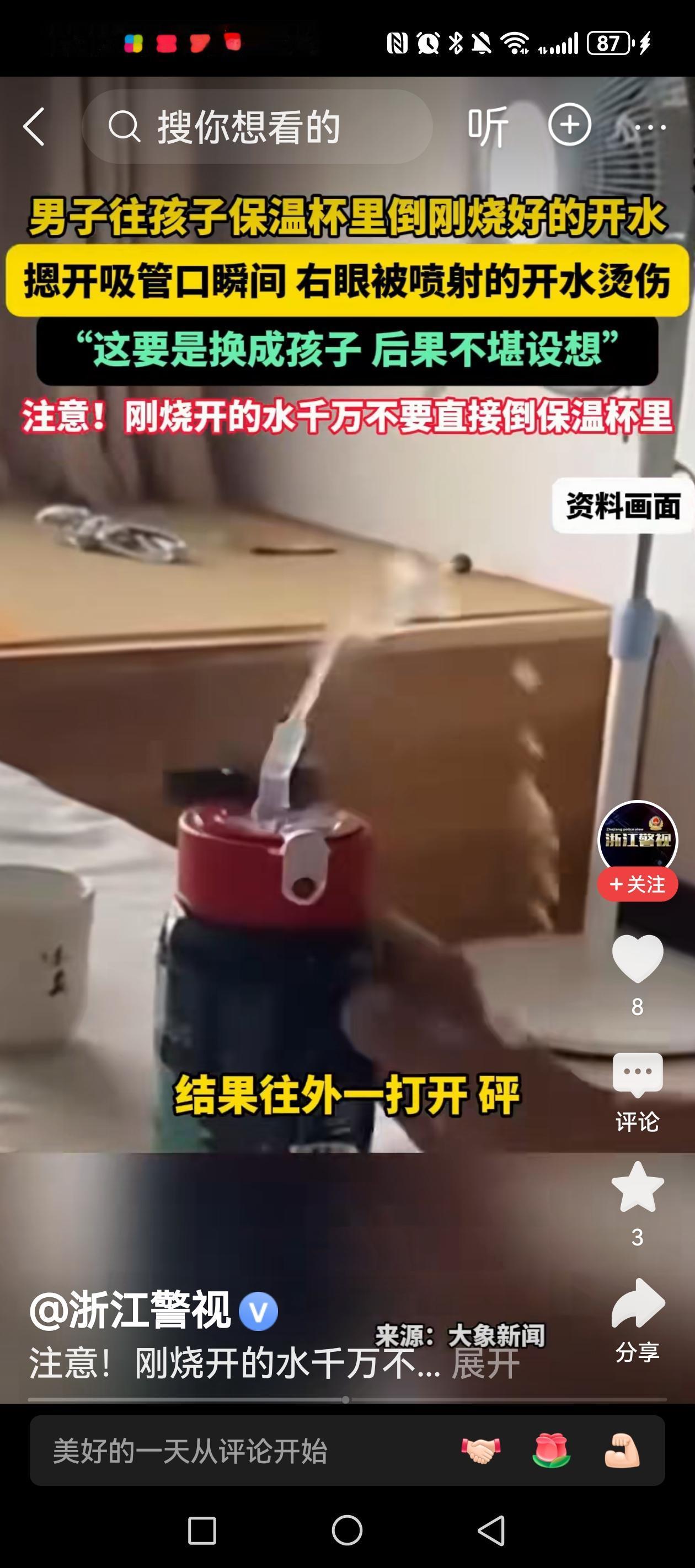这个真的注意了! 千万别直接往保温杯里倒开水,尤其是儿童用的带吸管的保温杯。 近日,陕西咸阳的何先生,往孩子用的保温杯里倒入刚烧开的水,想烫烫杯子,结果,打开吸管口的瞬间,热水从吸管喷射出来,烫伤了何先生的右眼。太危险了,如果不慎倒入温度太高的水,很容易烫伤孩子。现在的小学生都自带保温杯,为了安全,给孩子带水的时候,最好倒入45度以下适合口感的温水,做家长的这些小常识一定要牢记!