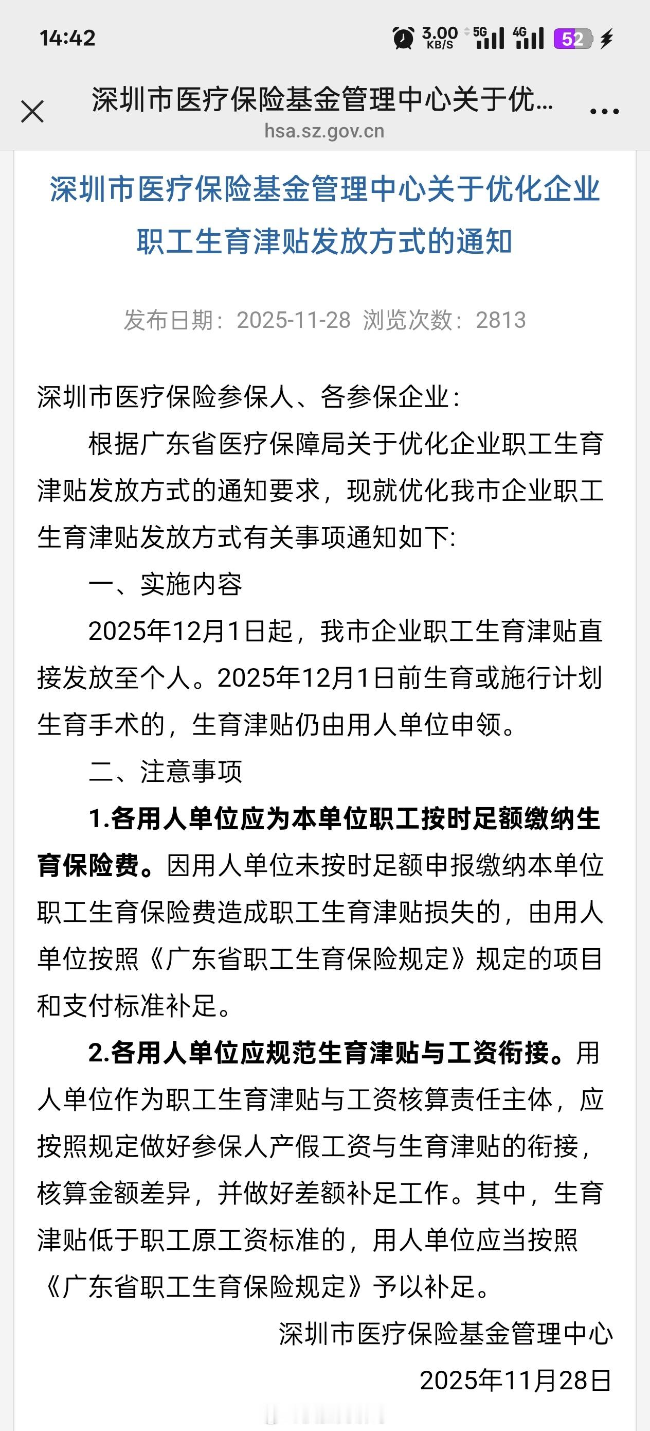 深圳市生育津贴直接发放至个人 深圳人注意了!2025年12月1日起,深圳市企业职工生育津贴直接发放至个人。2025年12月1日前生育或施行计划生育手术的,生育津贴仍由用人单位申领。 深圳