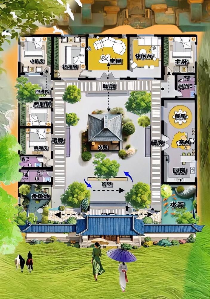 你看,用青砖灰瓦马头墙,打造的合院,每一角落,都能拿捏人心! 484㎡改编太牛了! 这格局,很智慧,布局很得体,动线情商很高,六居室一点也不厚此溥比! 古人的智慧和审美,体现在肥梁瘦柱花格窗,融入到四进院,让每个房子,得到最好的效果! 比如说一进院,它是扛把子,它负责意境美,花一样的格局,让自建房有自己的标签,重度四合院! 做为以水为景的,二进院与三进院,不走寻常路的布局,前移八米,把财富如灵气,留在一亩地大的院子里,讲究人生活智慧!, 还是一漂亮景儿,照顾到厨房和老人屋,把粉墙黛瓦和山石,发挥到极致! 最起码,保留老祖宗的文化精髓! 所以说,不是古人笨,他老人家已经把最经典的元素,留给自建房! 最后看四进院,啥功能不太行,四平天井,居然只是卧室的独家窗景! 特色之一! 为啥?合院传奇永不落幕,它致敬城里头乡坝头人的,进入大自然的世界,回归陶渊明的生活状态! 一个亩大的合院,凭一己之力,让男女老少都喜欢她。 它的最爱,实用为先,美学为辅,共呼吸的灵魂居所!