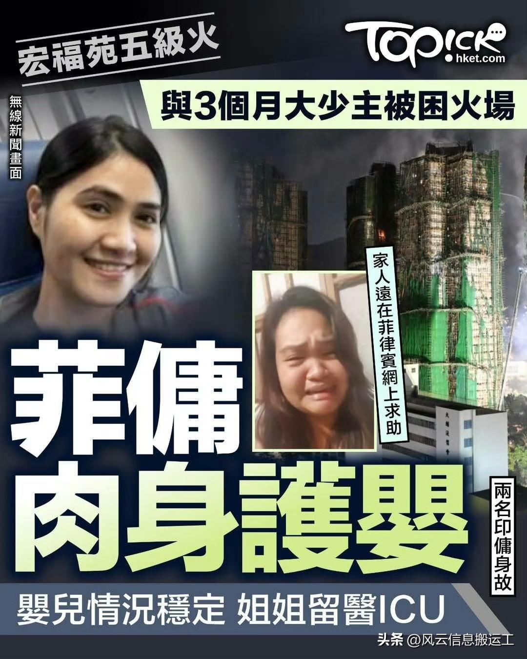 当消防员救出两人时,被女佣抱著的婴儿情况稳定,而女佣就需在深切治疗部留医。 据菲律宾及印尼领事馆最新数字,宏福苑内有199位印佣、82位菲佣工作,当中分别有11个印佣、19个菲佣仍然失联,而其馀的外佣仍未确认是否已获救。 来源Topick