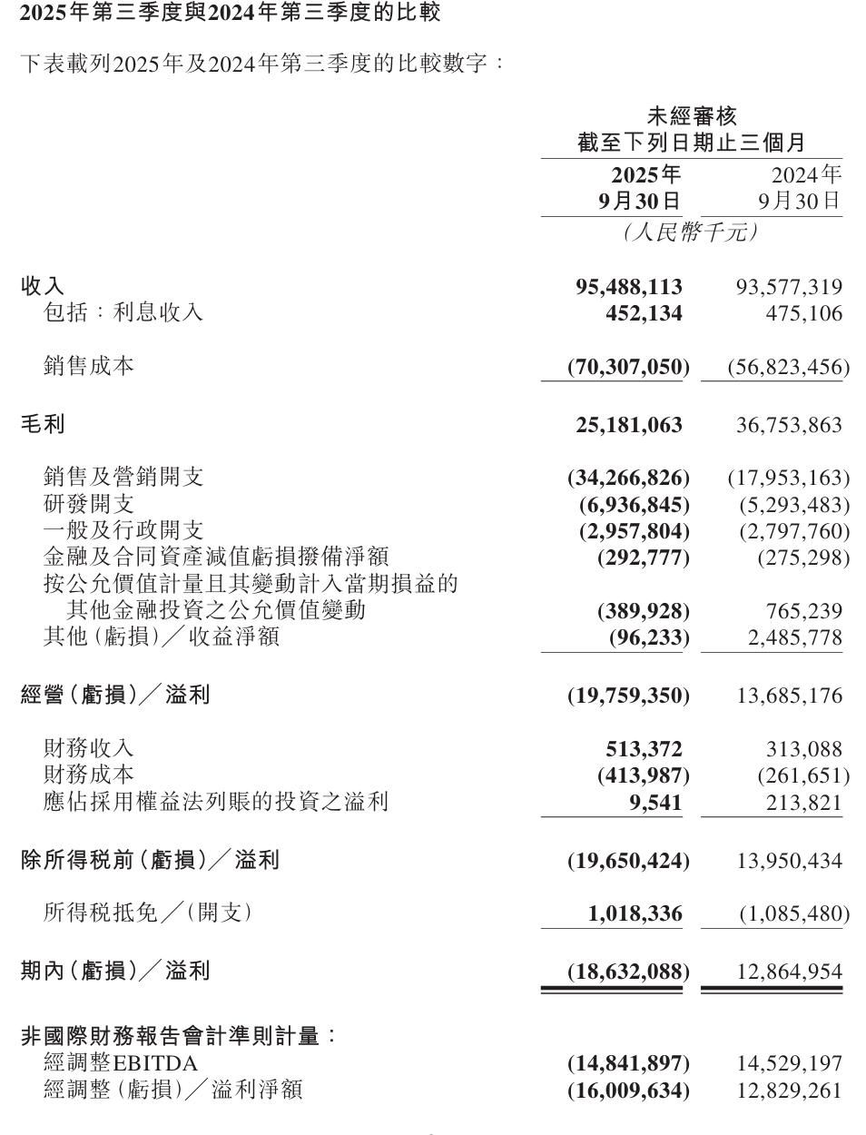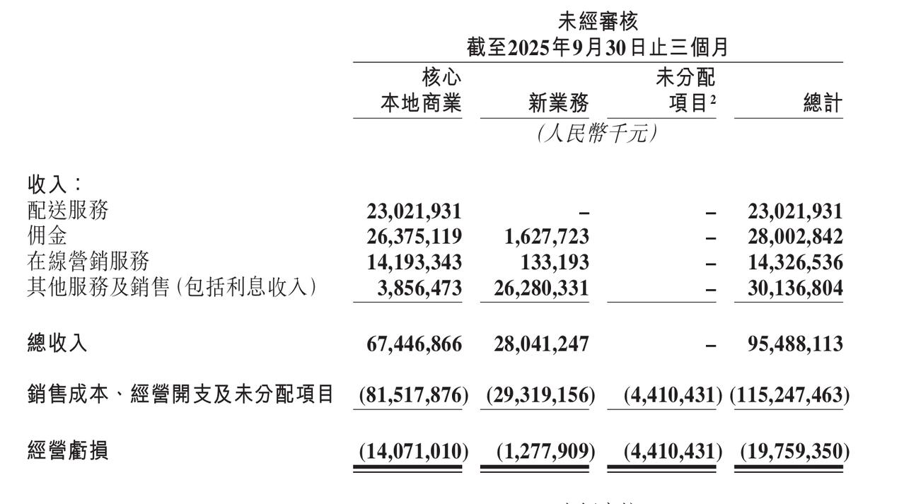美团2025年Q3收入955亿元,期内亏损186亿元 一、整体业绩:收入微增,利润由盈转亏 2025年Q3,美团总收入为955亿元,与2024年同期的936亿元相比,小幅增长2.0%。 然而,在收入微增的同时,公司的盈利能力出现严重下滑。经营利润从去年同期的盈利137亿元,转为亏损198亿元。期内利润也同样从去年同期的盈利129亿元,转为亏损186亿元。这反映出公司在当季面临着巨大的盈利压力。 二、分部收入表现:核心业务收缩,新业务增长强劲 核心本地商业分部(包括外卖、到店、闪购等):收入为674亿元,同比下降2.8%其中,配送服务收入下降17.1%,主要原因是公司为应对激烈竞争,大幅增加了对用户的补贴,这部分补贴直接从收入中扣除。佣金和在线营销服务收入仅实现个位数增长,增长明显放缓。 新业务分部(包括食杂零售、海外业务等):收入为280亿元,同比增长15.9%。增长主要得益于食杂零售业务(如小象超市)和海外业务(如Keeta)的扩张。 三、成本与费用:各项支出大幅攀升 利润转亏的主要原因在于成本与费用的大幅增加 销售成本同比增长23.7%至703亿元,占收入比例高达73.6%。增长主要由于骑手补贴提高、即时配送订单量增加以及海外业务扩张所致。销售及营销开支同比激增90.9%至343亿元,占收入比例升至35.9%。这主要是为了应对外卖行业的激烈竞争,公司大幅增加了推广、广告和用户激励的投入。 研发开支同比增长31.0%,主要源于公司在人工智能(AI)领域的投入增加以及雇员薪酬开支上升。 四、分部利润表现:核心业务由盈转亏,新业务亏损扩大 核心本地商业分部:经营利润从去年同期的盈利146亿元,转为亏损141亿元,经营利润率降至-20.9%。这是导致公司整体亏损的最主要原因,缘于毛利率下降以及激进的用户补贴和营销投入。 新业务分部:经营亏损从去年同期的10亿元扩大至13亿元,但亏损率环比有所改善。亏损扩大主要由于海外业务扩张带来的相关成本和开支增加。 总体来看,美团在2025年Q3陷入“增收不增利”的困境。尽管新业务和部分核心业务交易量仍在增长,但异常激烈的市场竞争,尤其是在外卖领域,迫使公司投入巨额补贴和营销费用以维持市场地位和用户黏性,这直接侵蚀了利润空间,导致核心业务由盈转亏。公司预计,由于市场竞争持续白热化,2025年第四季度的经营亏损趋势将会延续。