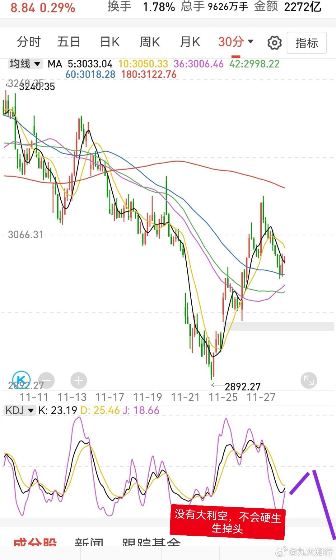 创业板半小时kdj从底部爬升,没有什么特大利空,它是不会掉头向下。周末会有什么大一点的利空吗?极大概率不会有。所以,可以布局个股。指数理论上就是这样区间震荡,月线不会有大起大落的迹象。跨年行情缓缓展开!