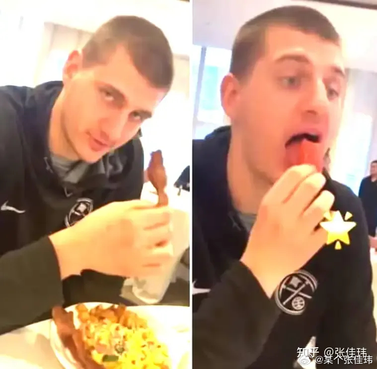 约基奇小时候是个大白胖子。他自己承认曾经每天要喝两三升可乐。飞美国航班上,他喝了最后一罐可乐。到丹佛后,一看队友们都龙精虎猛的体格,第一反应是想回家。他练力量,打篮球有氧够,但他吃东西不挑拣。所以作为运动员还能撑,甚至打了四年NBA,在2019年进NBA全明星,但难更进一步。转折点?他问助教艾亨伯格自己膝痛背痛怎么办,艾亨伯格说你如果正视饮食问题,你可以成为MVP。2019年初,艾亨伯格说我们来改变一切吧,约基奇说好。从此约基奇不再喝碳酸饮料,不喝啤酒,不吃零食。除了两样:橙汁,以及他妈妈从家乡来丹佛时,给他做的饭菜——但他也只吃一小口。他减了10磅,“感觉不错”;减了20磅,“我能扣篮啦?”减了30磅,“我能加速啦!”2018-19季,启动这个饮食计划前,约基奇场均20分11篮板7助攻。80场扣了11个篮。控制饮食后:两年后他场均26分11篮板8助攻,第一个MVP。72场扣了45个篮。次年蝉联MVP。第三年总冠军——季后赛场均30分14篮板10助攻。跟精干的吉米对抗,也不会显臃肿了。——第四年第三个常规赛MVP,上季场均30分13篮板10助攻,本季场均30分13篮板11助攻。17场10个三双,9个扣篮。爱不爱扣和能不能扣,两回事。五年前那句“减了20磅,我能扣篮啦!”2024年他分享过早餐,说有5000卡路里。具体吃的?“吃的:5个鸡蛋。火腿、培根、奶酪、菠菜。燕麦片、山核桃、杏仁、蓝莓、蜂蜜。”“喝的:浆果、香蕉和一点苹果汁摇匀当饮料。”分量很足,但大多算健康。分享早餐时,他长图2这样。约基奇饮食