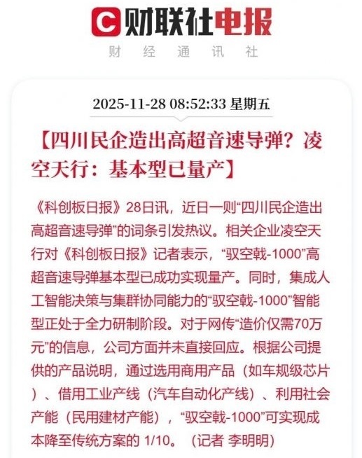 民企回应“手搓高超弹”:基本型已量产,成本仅为传统方案的十分之一!“凌空天行”回