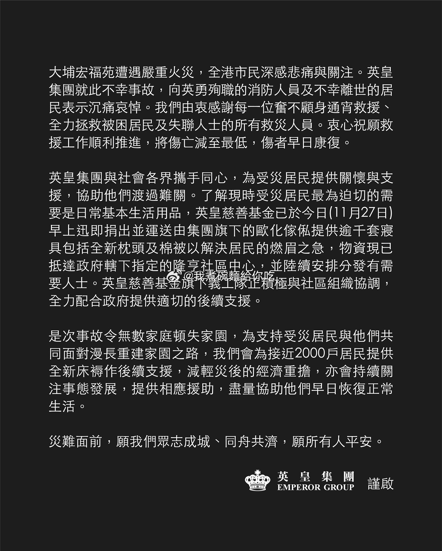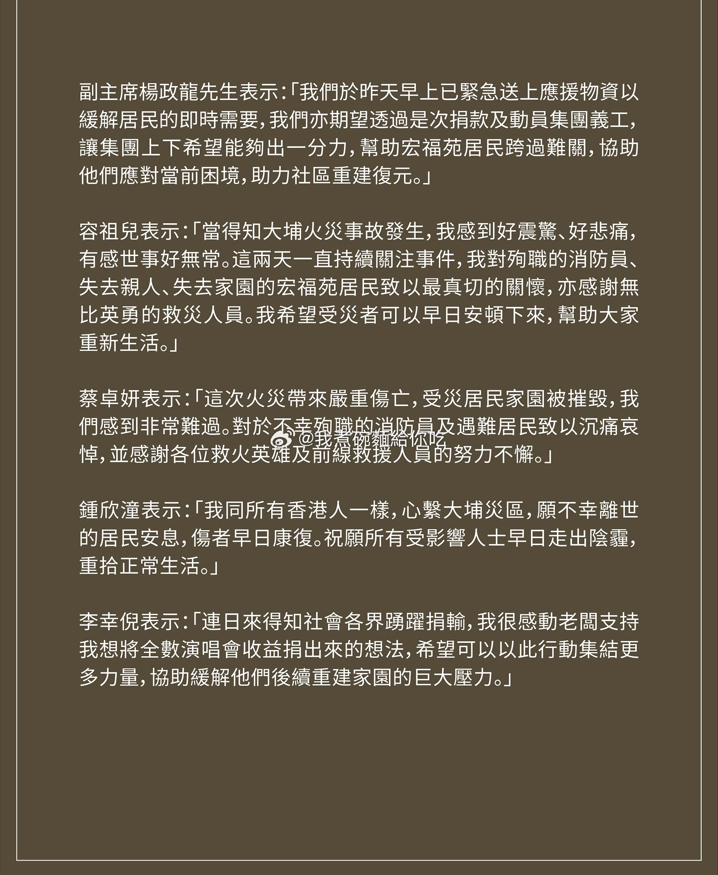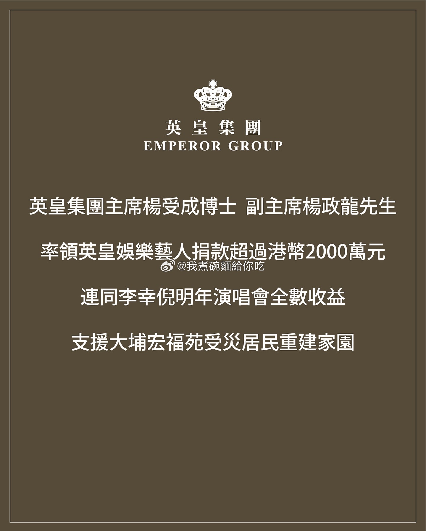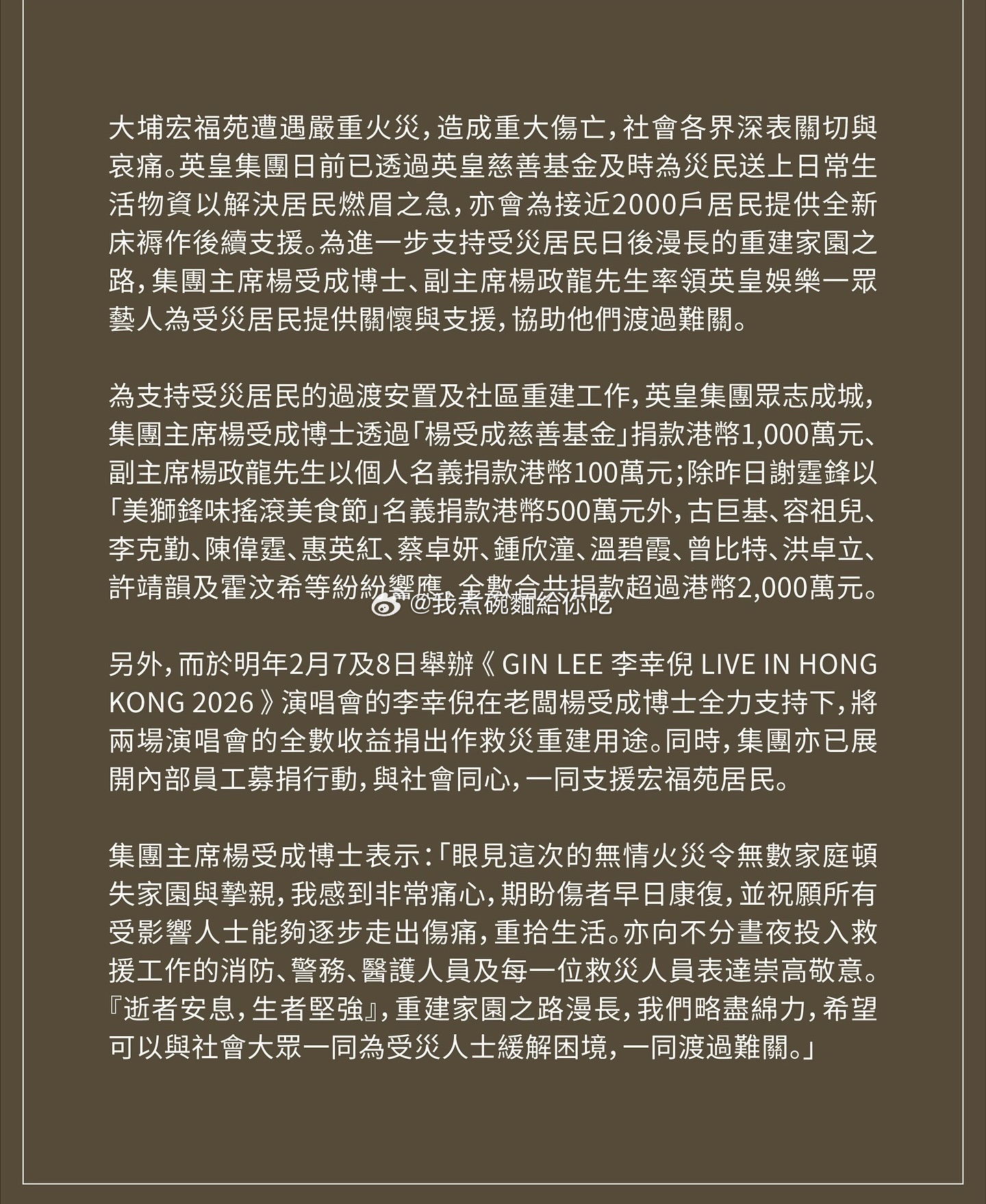 香港大埔宏福苑火灾|英皇老板杨受成率领英皇娱乐艺人捐款超过港币2000万元.杨受成透过「杨受成慈善基金」捐款港币1000万元、儿子杨政龙以个人名义捐款港币100万元;除昨日谢霆锋以「美狮锋味摇滚美食节」名义捐款港币500万元外,古巨基、容祖儿、李克勤、陈伟霆、惠英红、蔡卓妍、钟欣潼、温碧霞、曾比特、洪卓立、许靖韵及霍汶希等纷纷响应,全数合共捐款超过港币2000万元,连同李幸倪明年演唱会全数收益,支援大埔宏福苑受灾居民重建家园。