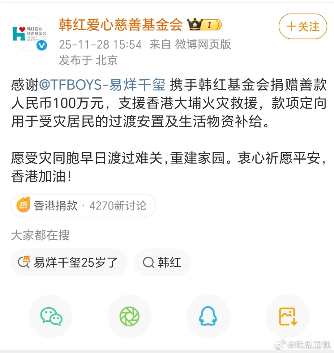 啊看到韩红基金会报道,王一博 千玺 杨紫等都捐款100万
