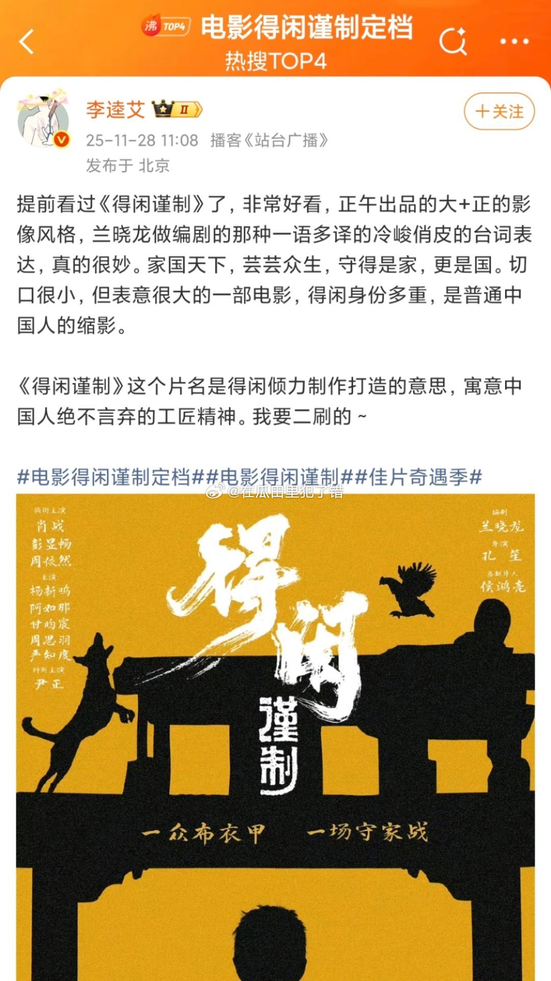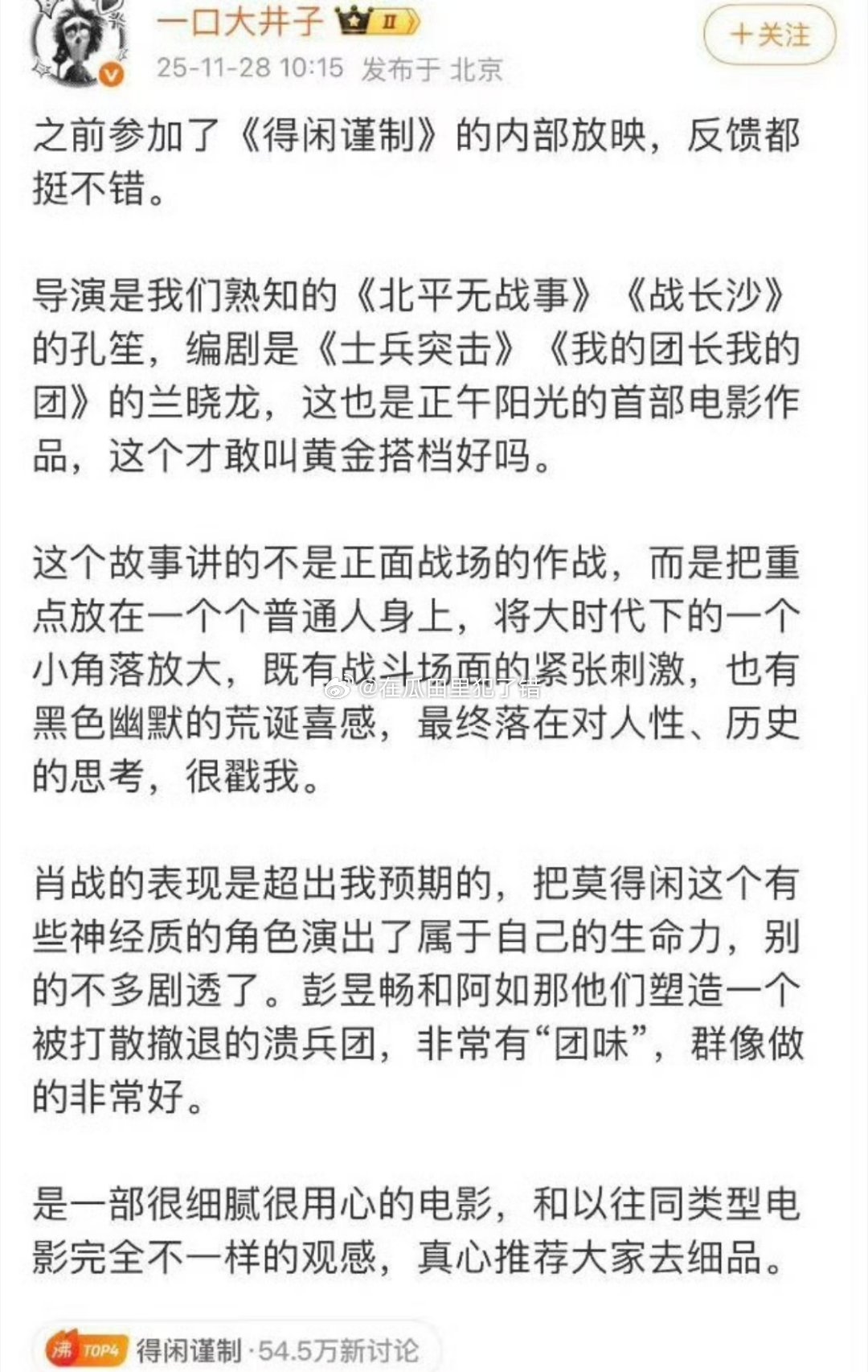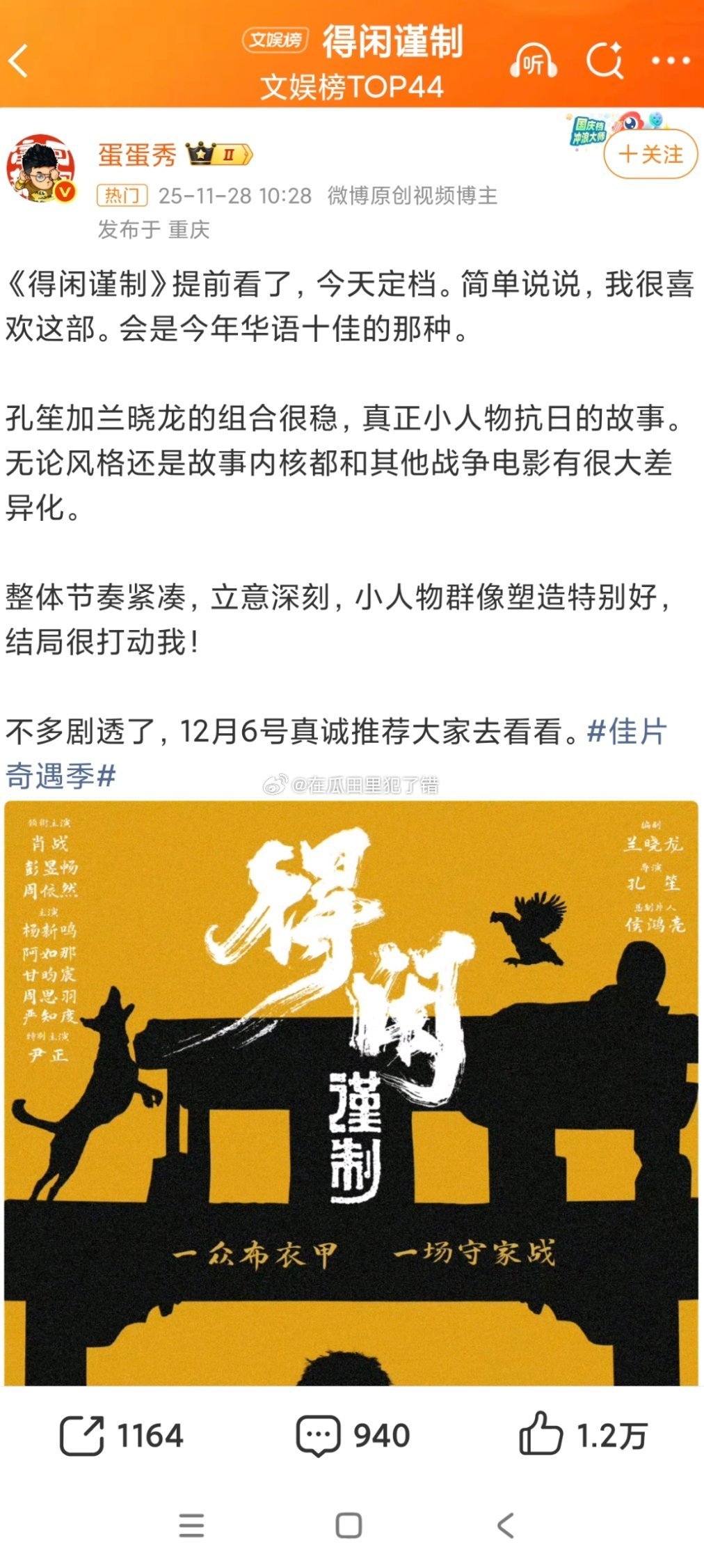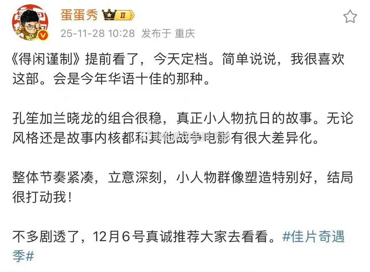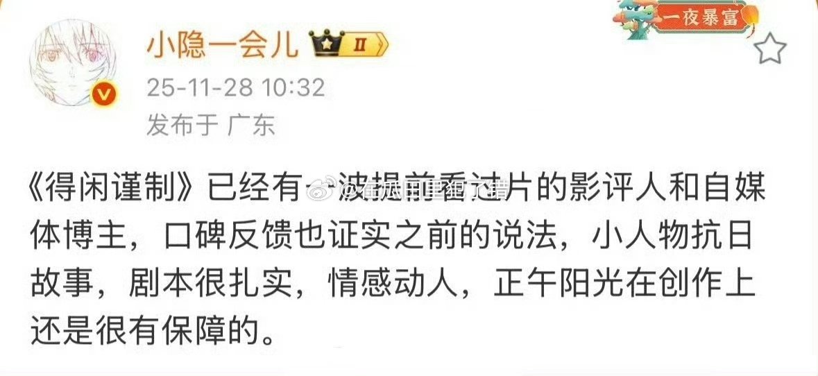 肖战彭昱畅周依然领衔主演 肖战主演的得闲谨制定档12.6正式公映,已经有一批业内发了看片repo了,很久没有这很久没有这种小人物黑色幽默抗日的电影了,蛮期待的正午阳光的第一部电影
