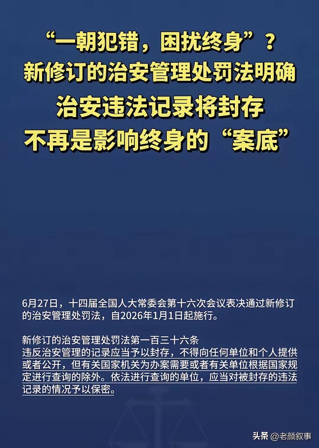 “治安违法记录封存制度”,给曾经犯错的人一次彻底“翻篇”的机会! 之前只要违反过治安管理,不管是酒驾、嫖娼,还是吸毒、打架斗殴,相关记录都会一直存在,一次犯错就被贴一辈子“坏人标签”。 但从2026年开始,这一切要变了!所有违反治安管理的记录,不管情节轻重,都会依法封存,不得向任何单位或个人公开。 这次新规可不是随便改的,既守住法治底线、维护社会秩序,更给曾经犯过错的人一个“重新开始”的机会。治安处罚条款 治安法新规 治安处罚法 违法的后果 治安处罚种类 简易处罚程序 违规界定