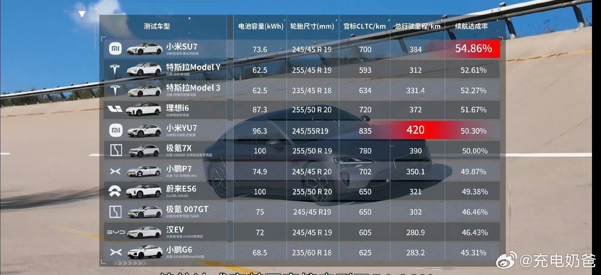 懂车帝的这个高环测试,大家比较关注的几款车的续航达成率排名如下:1、小米SU7:54.86%2、model Y:52.61%3、Model 3:52.27%4、理想i6:51.67%5、小米YU7:50.30%大家关注排名就可以,续航达成率是属于比较极端的情况下测出来的,主要为了测评极端场景下三电系统的效率和一些技术冗余能力,大家正常开的续航达成率都会高于这些数值的理想i6理想i6