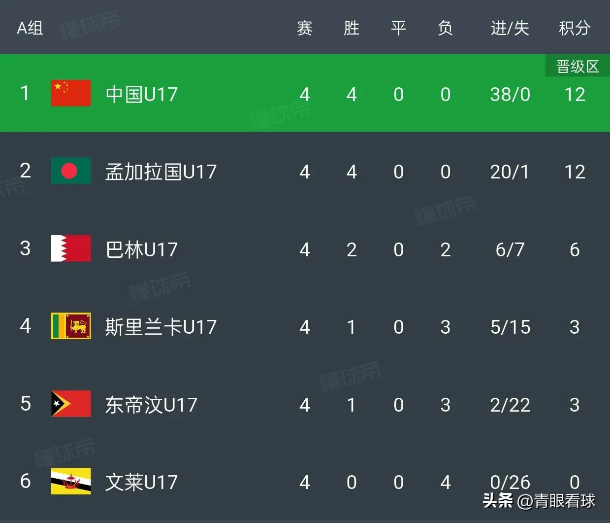 U17国足4场比赛狂轰38球,进球数超过了同组其他5支球队的进球总数。U17国足的统治力太强了,在亚洲足坛处于独孤求败的地位。 孟加拉20球,巴林6球,斯里兰卡5球,东帝汶2球,文莱0球,其他五队的进球总和是33球,比国足少5球。 整个U17亚预赛,U17国足的进球数也是最多的,比第二名越南多16球。