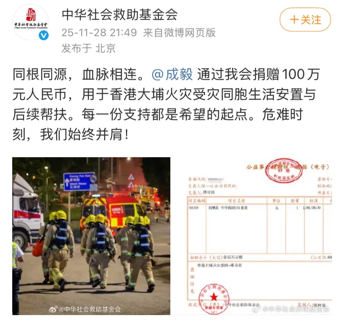 成毅向香港灾区捐赠100w。一起支持!
