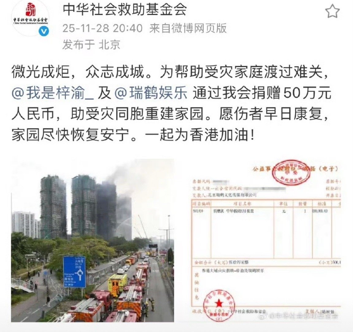 易烊千玺为香港火灾救援捐款100w,祈福灾区!