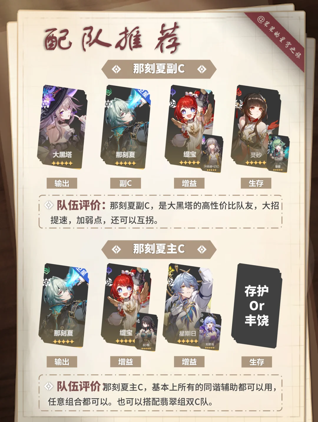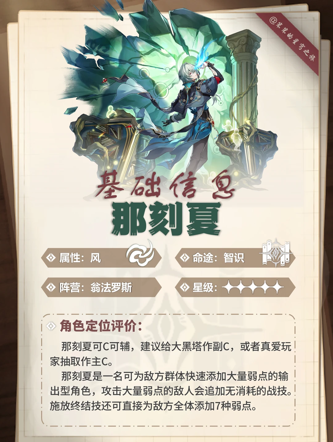 🐱大家好,我是笨笨的铲屎官 今天给大家带来的是那刻夏培养攻略 那刻夏推荐给大黑塔 作副C或者辅助,0+0即可 真爱玩家玩主C的话 推荐0+1起步 你打算作副C还是主C?