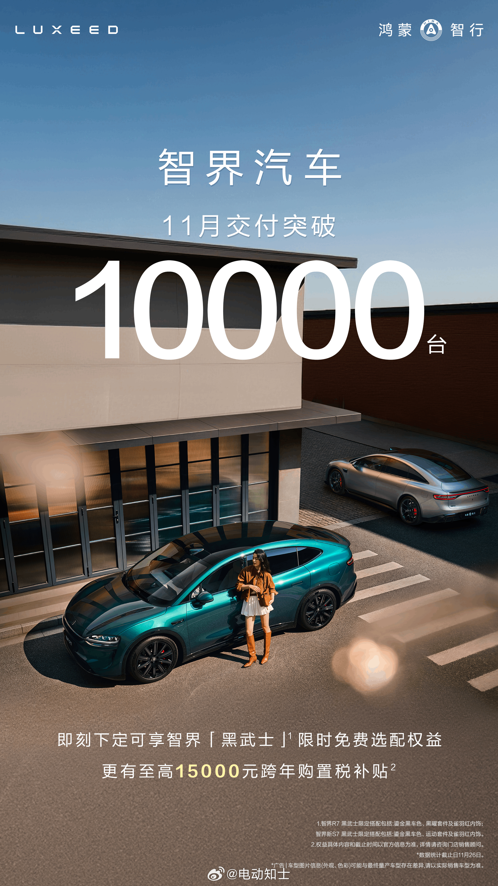 智界汽车11月交付突破1万台,连续2个月交付过万,连续3个月大定破万。 改款智界R7和智界S7还是很有竞争力的,明年还会上MPV,智界终于找到自己的节奏和定位了[馋嘴] 智界R7鸿蒙智行新能源汽车