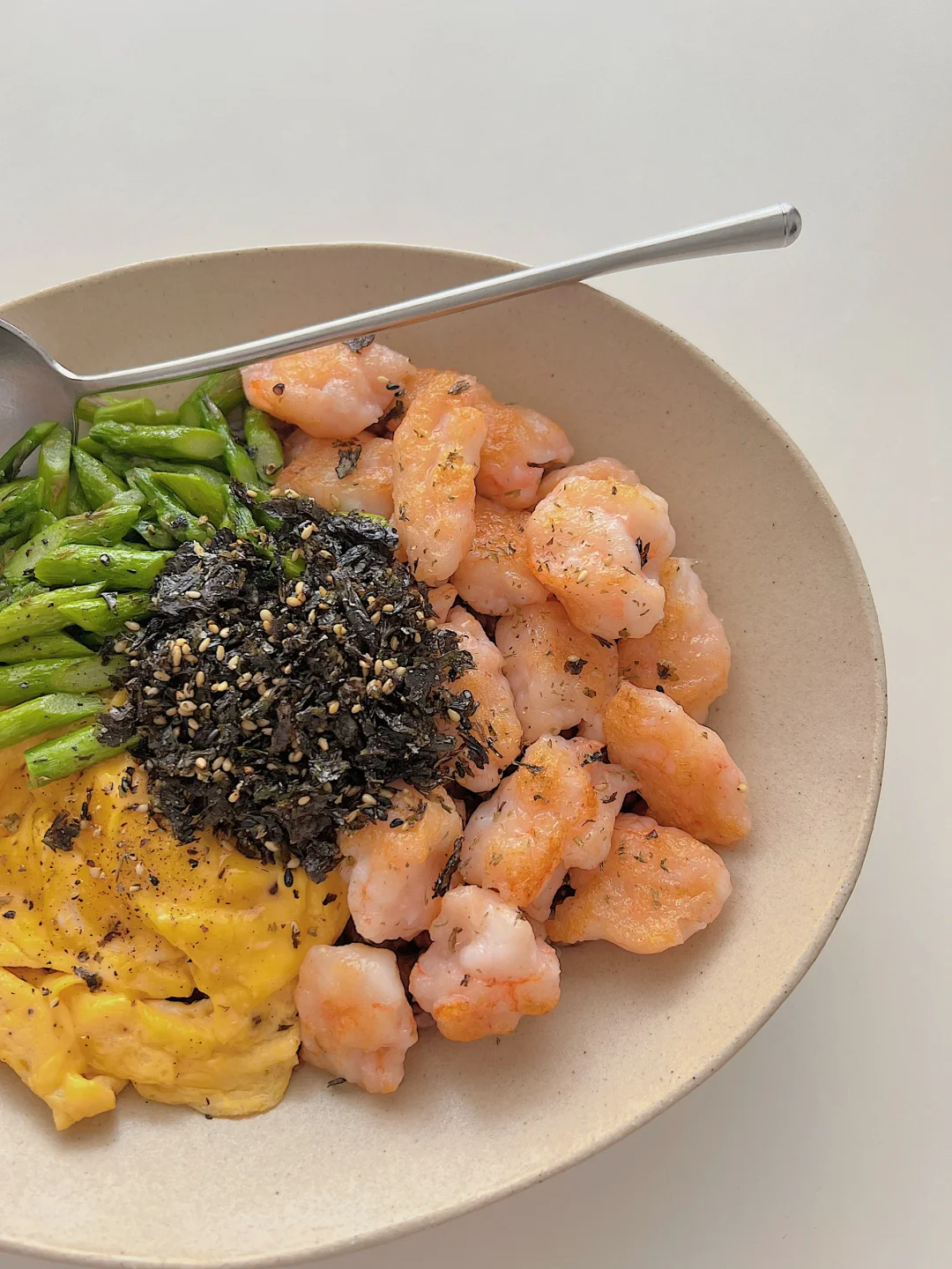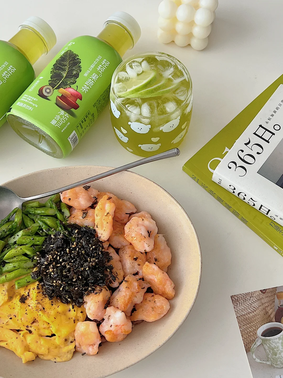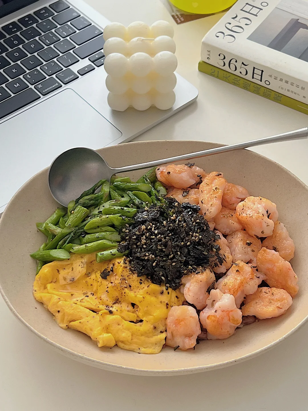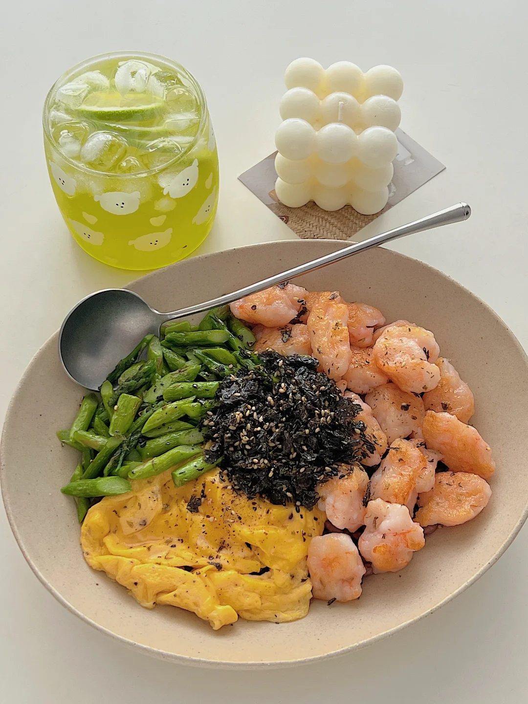 虾滑+芦笋+滑蛋+黑芝麻=治愈系配色!