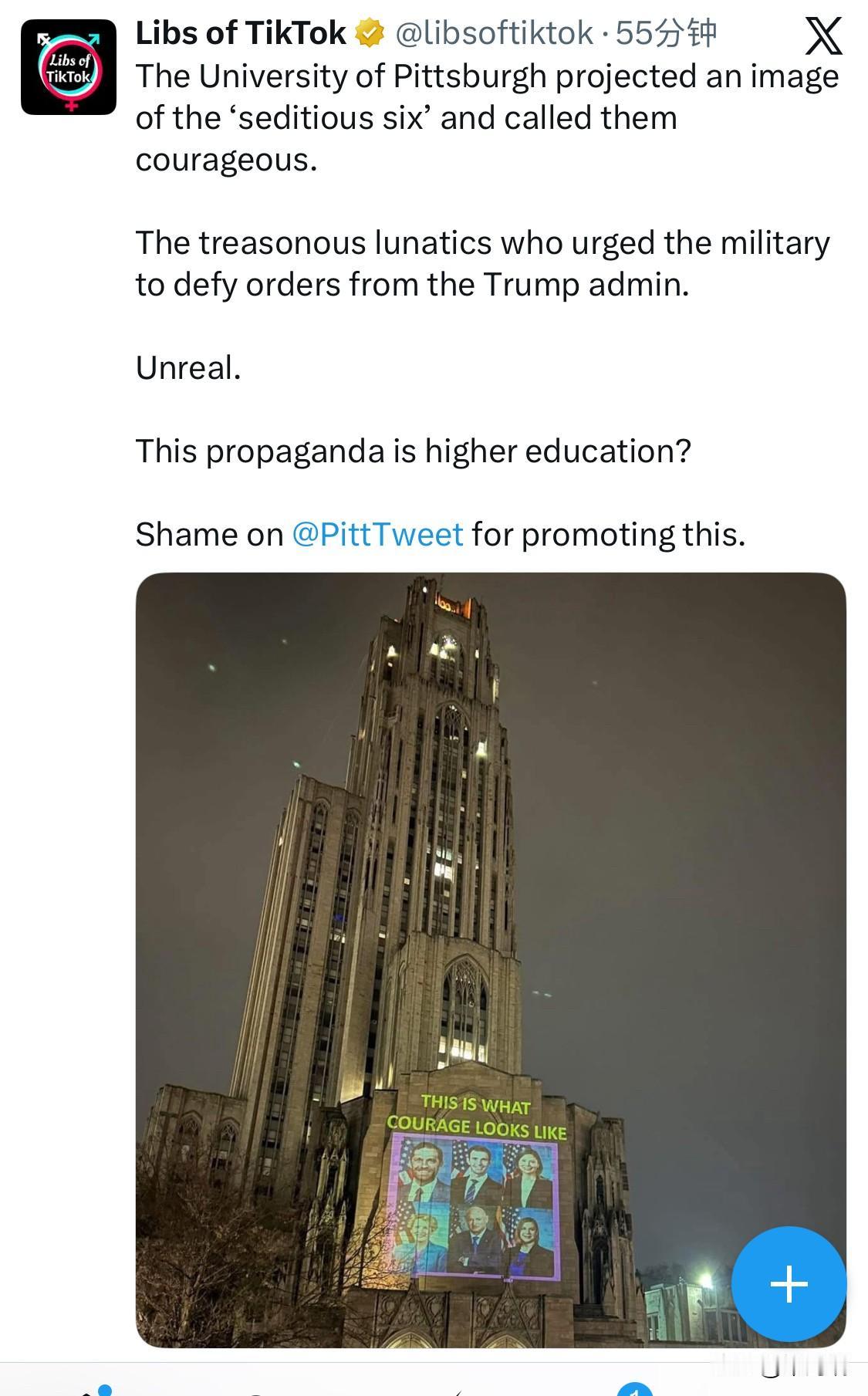 美国匹兹堡大学投影了“六名煽动叛乱者”的画像,并称他们勇敢无畏。 煽动军方违抗特朗普政府命令,美国高校这种宣传也算是高等教育吗?
