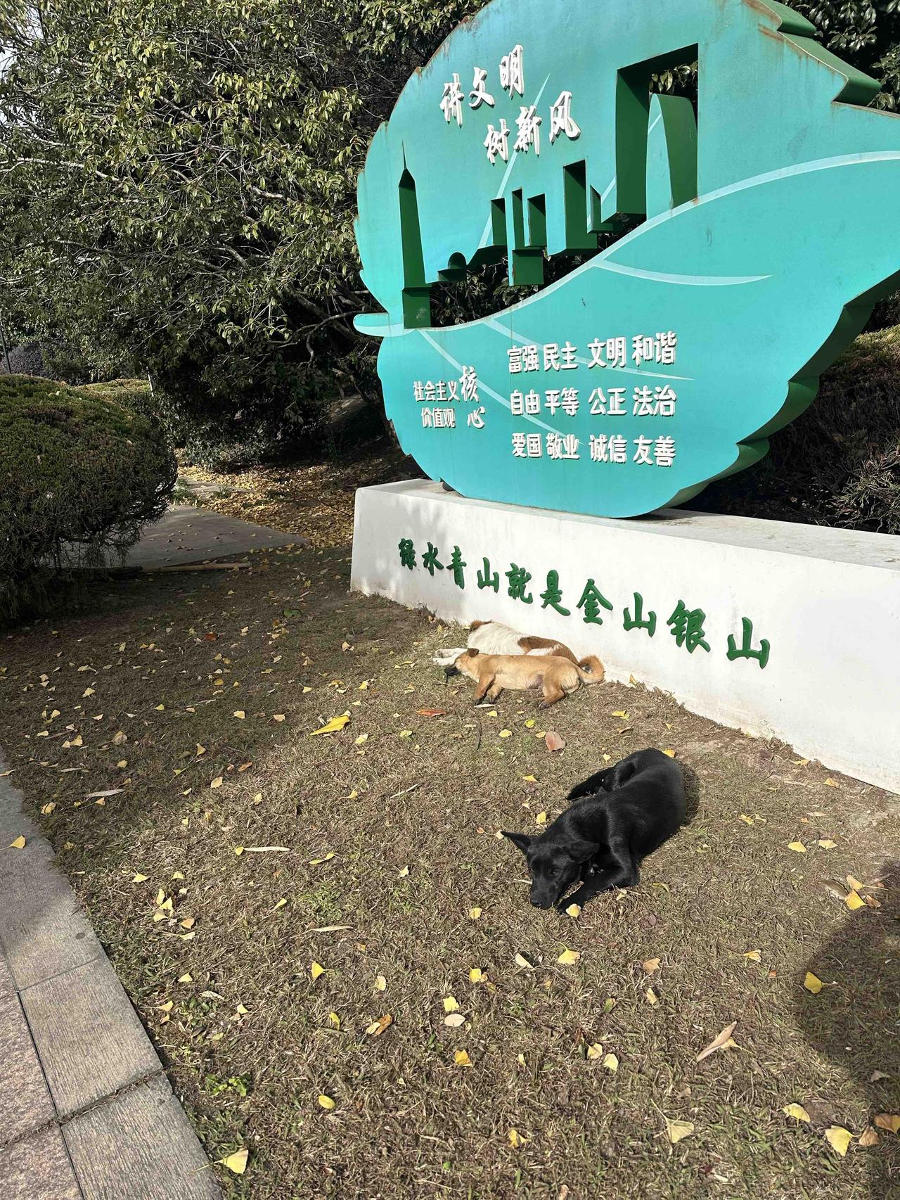 冬日生活随拍 昨天,清晨的公园裹着一层淡淡的凉意,阳光却慷慨地洒下来,给草木和雕塑都镀上了暖金。我照例来晨练,却被这一幕戳中柔软——几只小狗蜷在“绿水青山就是金山银山”的雕塑旁,正懒洋洋晒着太阳。黑色的小狗趴在草地上,黄毛的伙伴窝在雕塑基座边,全然不顾周围的动静,只顾着享受冬日暖阳。 晨练的脚步不自觉放慢,看着它们惬意的模样,连带着自己的心情也跟着松弛下来。冬日的美好,往往就藏在这些不期而遇的温柔瞬间里。冬日公园晨练日常 晒太阳的治愈小狗