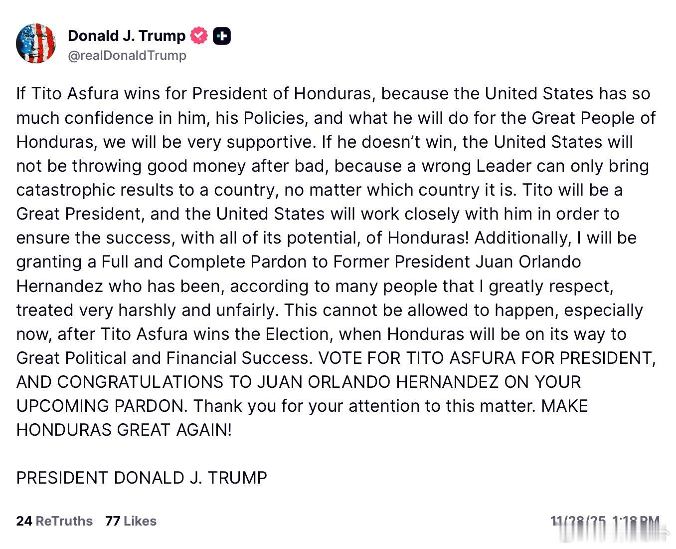 特朗普将赦免洪都拉斯前总统胡安·奥兰多·埃尔南德斯,他目前因参与毒品交易在美国监狱服刑45年。因为此时正值洪都拉斯关键选举前夕。"如果提托·阿斯富拉赢得洪都拉斯总统选举,由于美国对他、他的政策以及他将为洪都拉斯伟大的人民做出的贡献充满信心,我们将非常支持他。如果他没有赢,联合国将不会继续浪费资源,因为错误的领导者只会给国家带来灾难性的后果,无论哪个国家都是如此。提托将会是一个伟大的总统,联合国将与他紧密合作,以确保洪都拉斯充分发挥其潜力,取得成功!此外,我将会对前总统胡安·奥兰多·埃尔南德斯颁发完全和完整的特赦,因为据许多我非常尊重的人所说,他受到了非常严厉和不公正的对待。这种情况不能发生,尤其是在现在,提托·阿斯富拉赢得选举后,洪都拉斯将走向伟大的政治和经济成功。投票支持提托·阿斯富拉为总统,并祝贺胡安·奥兰多·埃尔南德斯获得即将到来的特赦。感谢您关注此事。让洪都拉斯再次伟大!"总统唐纳德·J·特朗普