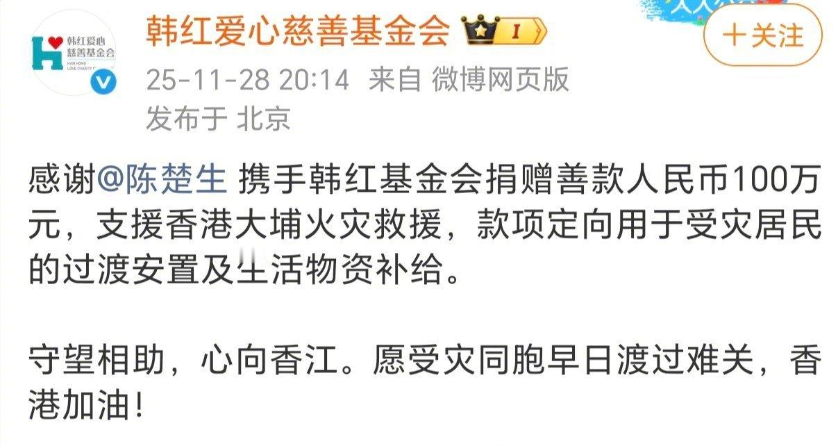 陈楚生捐赠100万元陈楚生携手韩红基金会捐100万支援香港大埔火灾救援,款项定向用于受灾居民安置和生活物资补给,这份守望相助的担当太戳人!