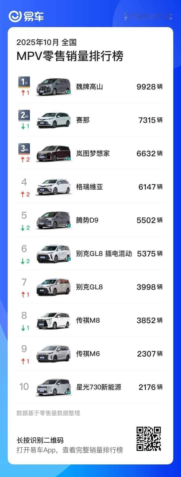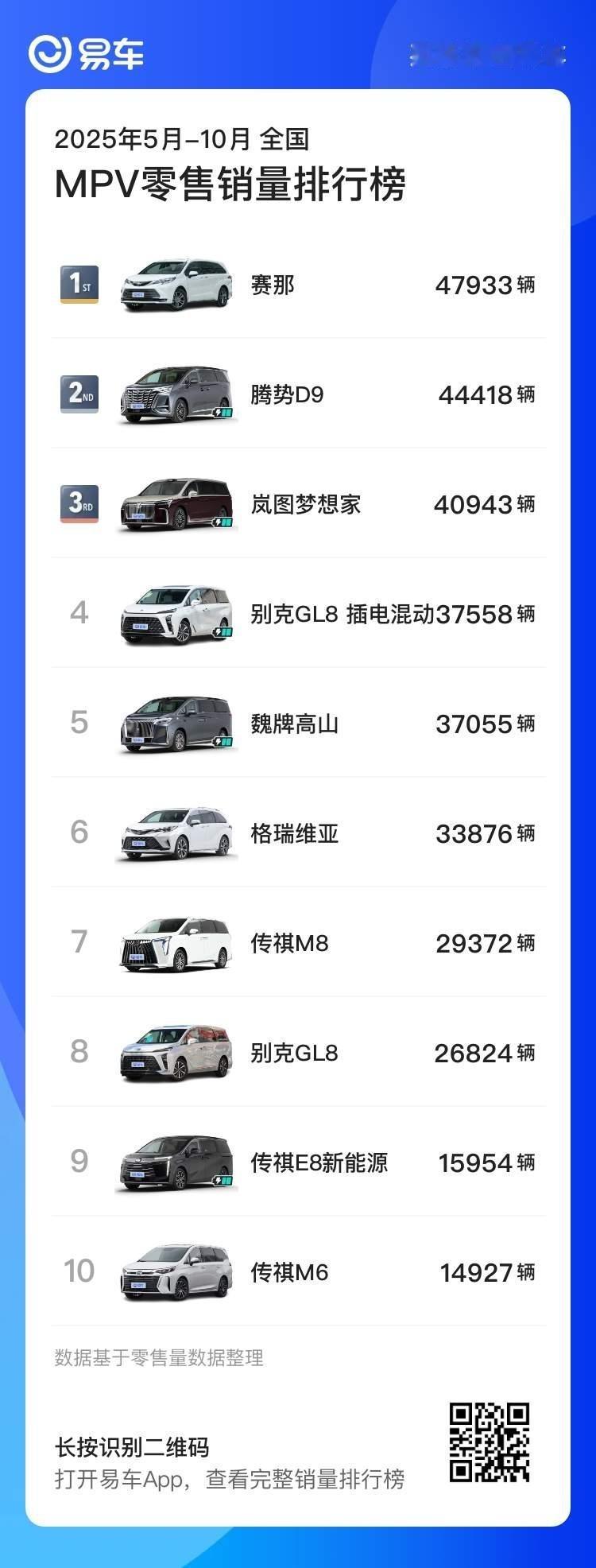 单月MPV TOP10的销量合计在5万台左右,全年的市场空间在100万左右近年来大型SUV都在MPV化,越做越大,功能越来越全,其本质是消费者有MPV功能的需求,但是不太接受MPV的造型,所以才有了SUV代替MPV的说法但是MPV的市场容量远低于SUV,即便有所影响,绝对值也不会很高。但反过来MPV如果去做SUV化,SUV的市场远大于MPV,这样市场空间就打开了。模糊SUV和MPV的边界,可能是未来的一个趋势新能源汽车