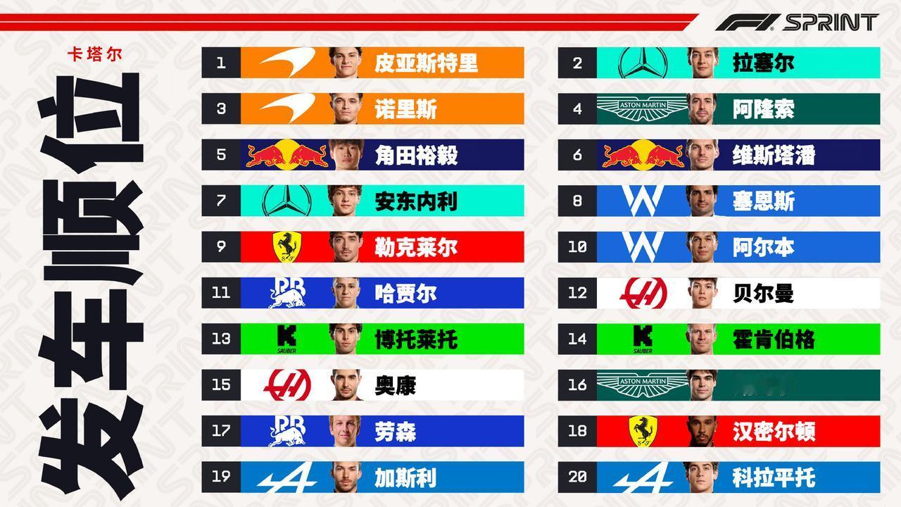 潘子可能因为在冲刺排位赛的调校问题,丢掉WDC的争夺席位,“连”队友角田都排在了潘子身前。 第三位的是阿隆索,论能力,这个老家伙在围场里绝对是名列前茅的,最重要的是,体力依旧很好! 汉密尔顿,SQ1就出局了,我看有人说他是不是老了,或者他没办法开地球车? 皮亚斯特里,继续保持WDC的可能性,冲刺赛杆位发车,状态是不是必须要在最后两场才能找回来???【来自懂车帝车友圈】