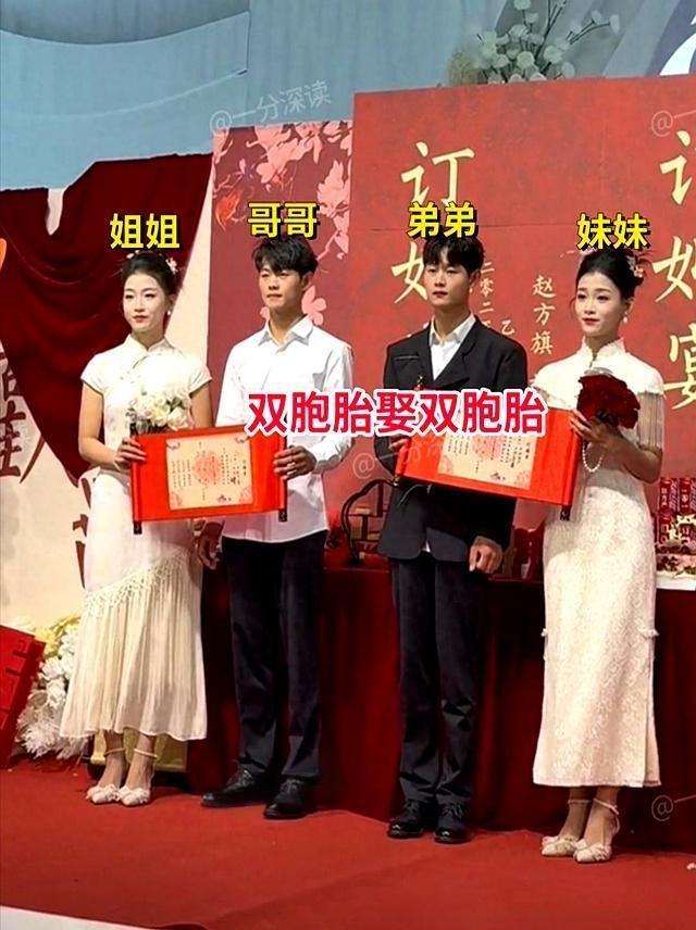 河南双胞胎兄弟娶双胞胎姐妹!婚礼现场如复制粘贴,亲友集体懵圈:到底该随一份礼还是两份? 这场商丘婚礼太像偶像剧了!两对新人站在一起宛如镜像,连礼服都像同一个模子刻出来的。最蒙圈的是亲友团——给哥哥当完伴郎,还得赶场给弟弟当;红包都得准备双份! 专家说了,这俩对极可能是异卵双胞胎,不然就成近亲结婚啦!未来他们的孩子既是堂亲又是表亲,过年走亲戚串一次门就够了。 现在小年轻真会玩,据说湖南还有一对00后双胞胎姐妹准备年底嫁双胞胎兄弟。这缘分,月老牵红线都得用双股的吧!你看好这样的“复制粘贴式婚姻”吗?