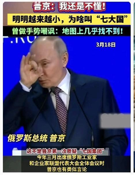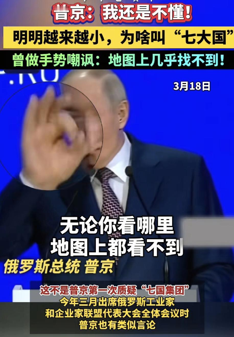 普京这个姿势在寻找,小英,小法,小意,小美,小德,小日子你们在哪里,他们可喊你们7大国,工业产值也就占到30%而已,人口7亿多,就比世界平均值高一丢丢,而在G20里面也不显得怎么突出了,这普京的自信是怎么来的,无非就是三年多的战争,北约欧盟吃奶的力气都拿出来了,结果面对俄罗斯就那样,关键现在俄罗斯是进攻方。
