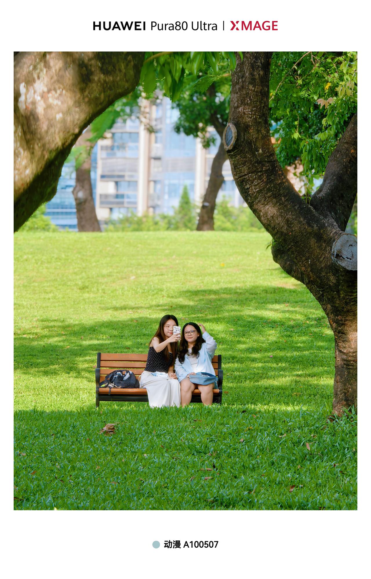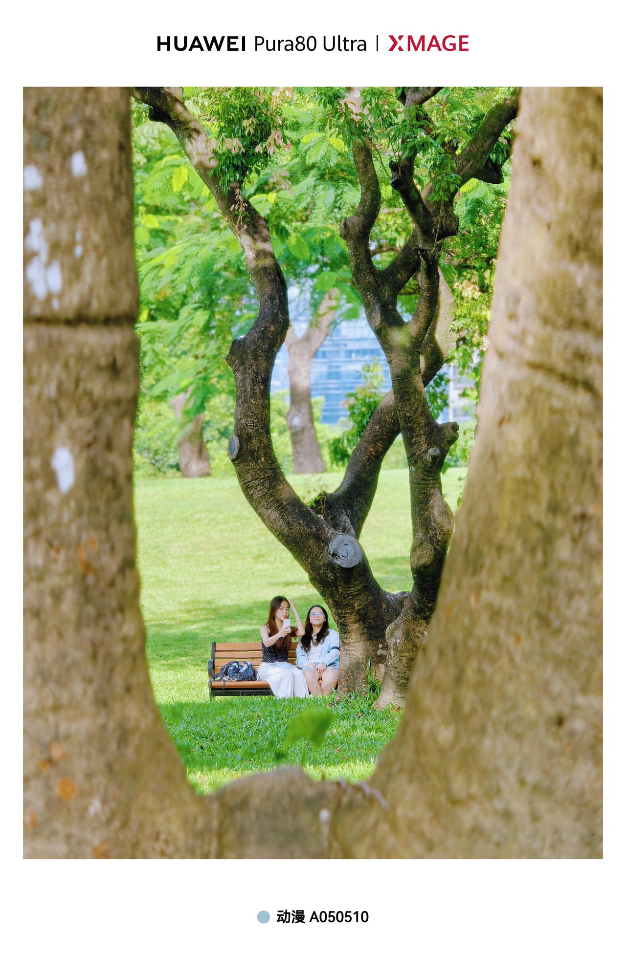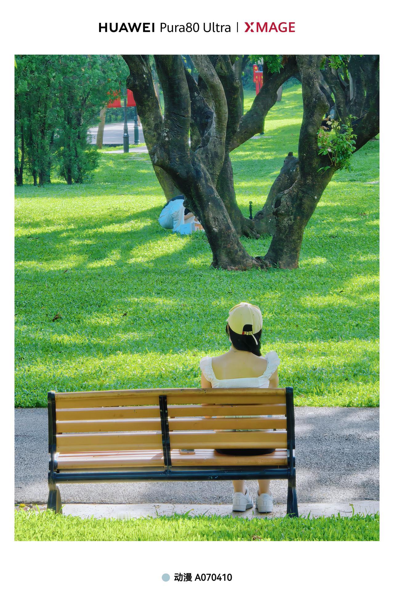 【Pur80ultra一目双镜:超级出片的中山公园】 深圳中山公园出片是超级好看的,一张椅子都能拍出很好看的照片来,椅子上坐坐就更出片了,再用用树的框架构图 展现不一样的视角。华为Pura80ultra XMAGE 影像 动漫 个性色卡出片。