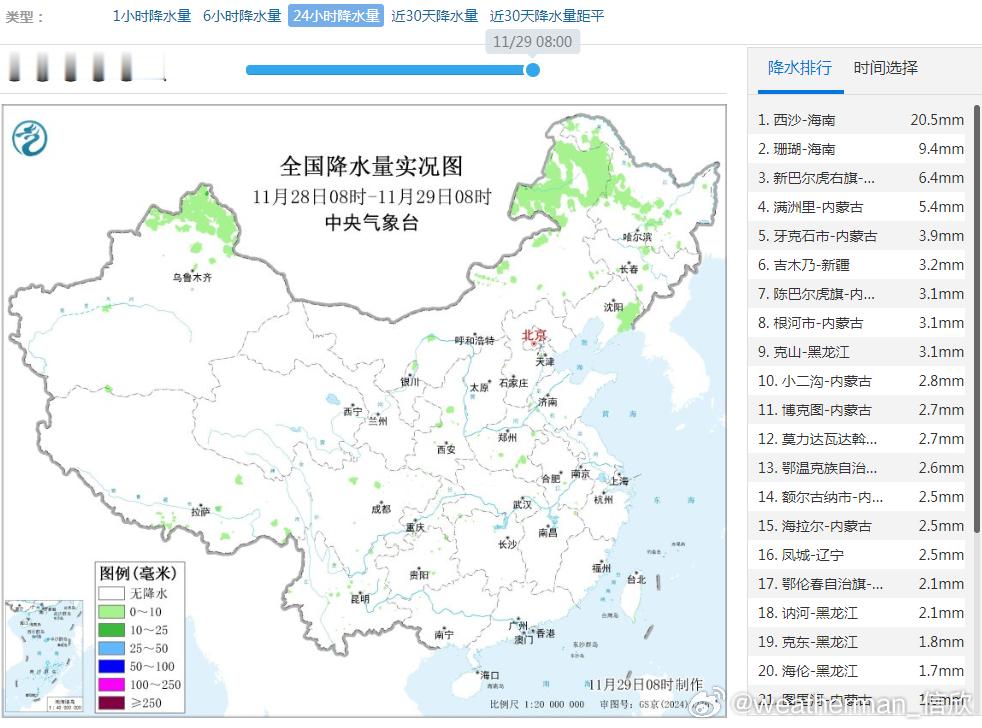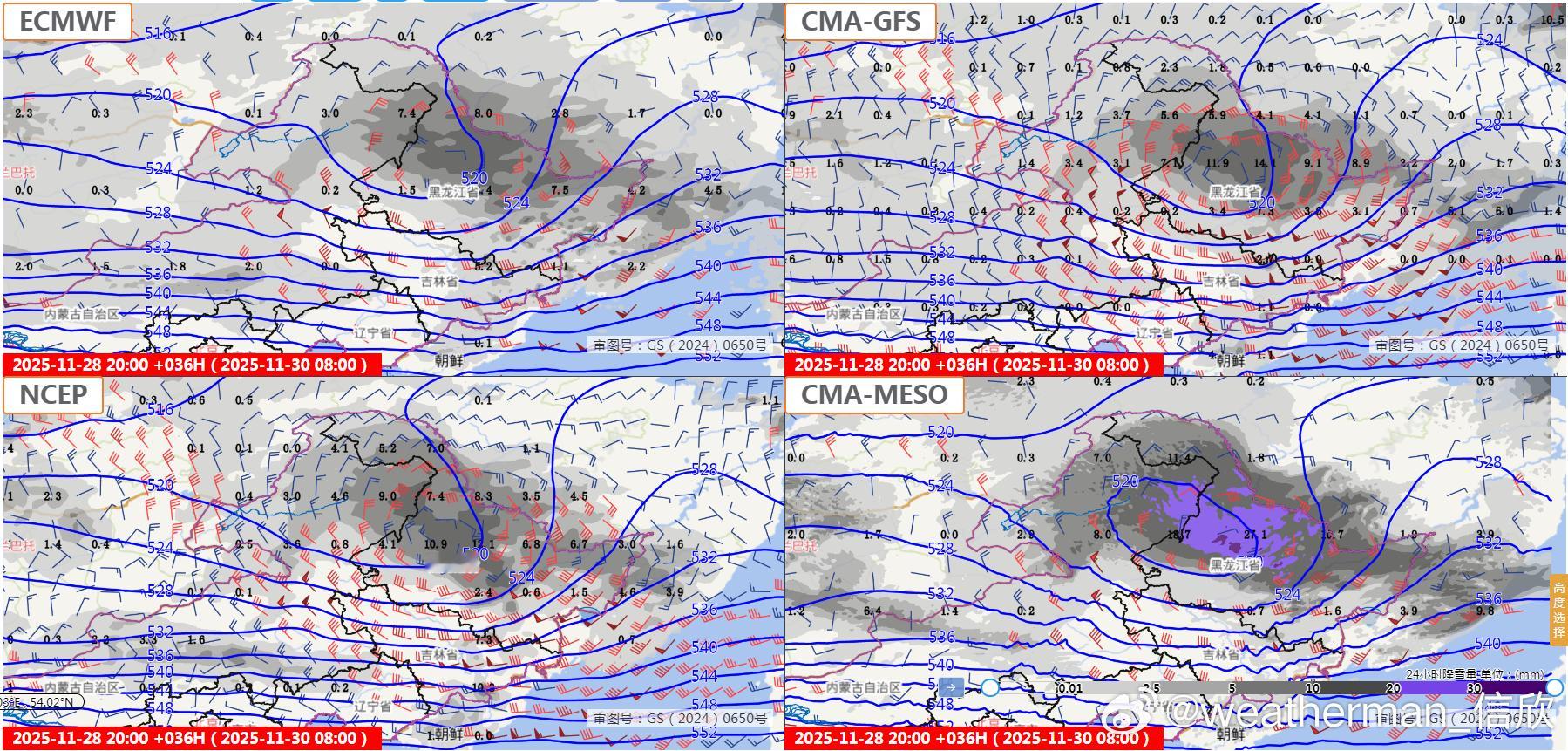 【降水】昨天到今晨,内蒙古东部一带降雪发展增多,新巴尔虎右旗、满洲里出现大雪。今晨积雪深度,新巴尔虎右旗12厘米、满洲里8厘米。今天导致降雪的高空槽+低涡+气旋继续东移,内蒙古东北部、黑龙江中北部等地部分地区有大到暴雪(10~15毫米),新增积雪深度4~8厘米,局地10厘米以上。图4为官方报,图5为数值预报的对比。我国的中尺度模式给出高空槽发展为冷涡,动力条件更强,因此给出黑龙江的降雪也更大,给出大暴雪。其他模式偏向于强度是大雪-暴雪。图6-7为数值预报给出的新增积雪以及明晨今晨深度预报。预计明后天,东北降雪逐渐减弱。此外今后三天,华南一带的降雨会有所增多。