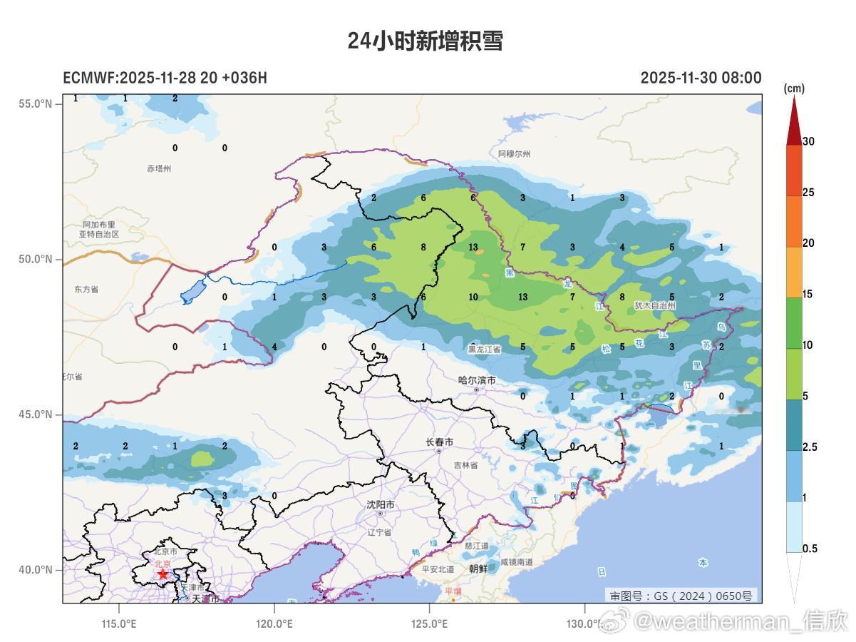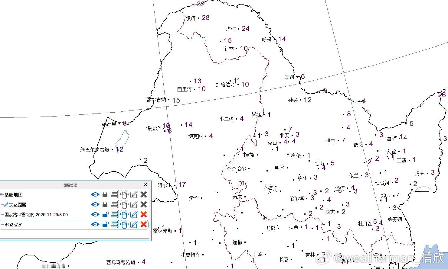 【降水】昨天到今晨,内蒙古东部一带降雪发展增多,新巴尔虎右旗、满洲里出现大雪。今