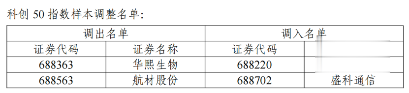 科创50指数样本股调入翱捷科技、盛科通信,调出华熙生物、航材股份。